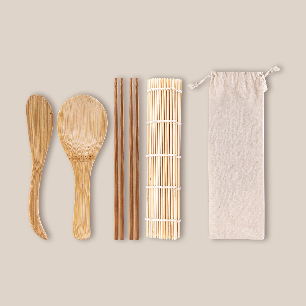 Conjunto de saco com 5 peças para sushi. Com esteira, 2 pares de varinhas, 1 pá de arroz e 1 espalhador.