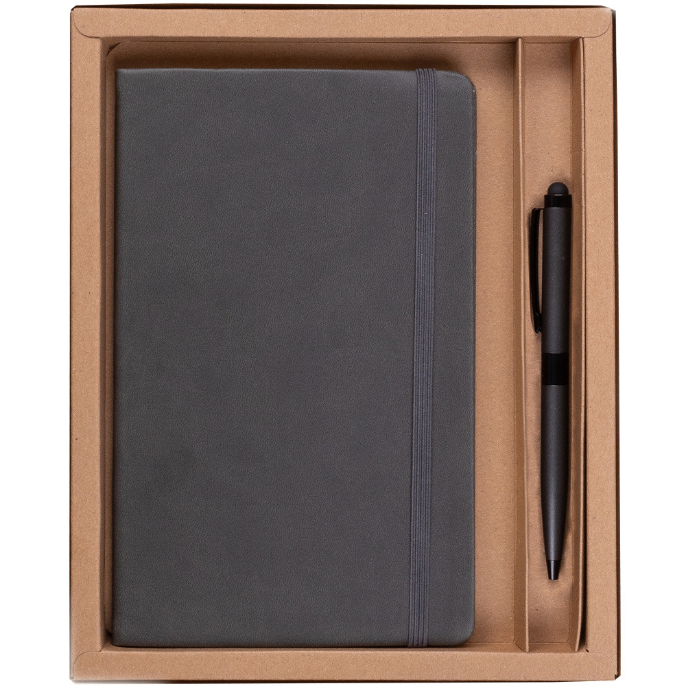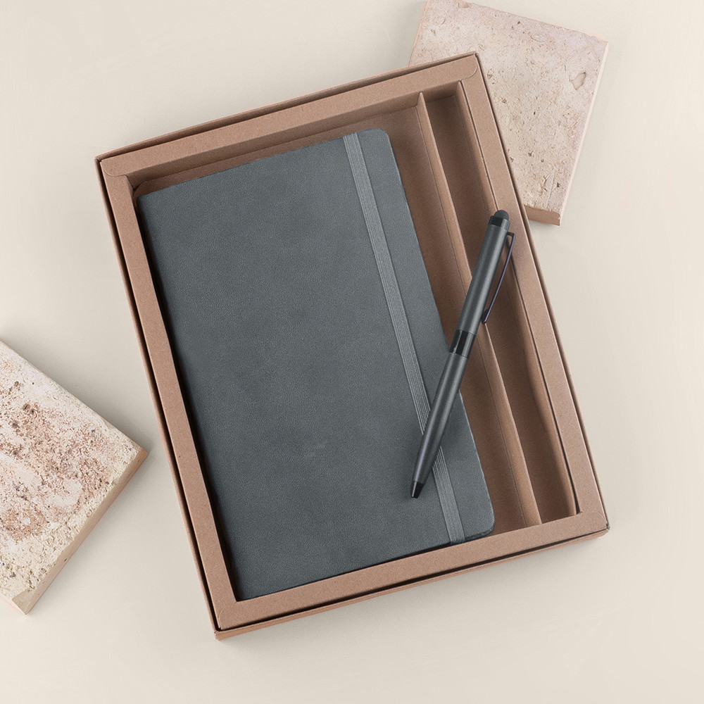 Elegante conjunto de bloco especial para impressão em laser e esferográfica metálica, apresentado em caixa de cartão kraft. Para encomendas impressas, o kit irá montado. Para encomendas sem impressão, o kit será enviado sem montar.