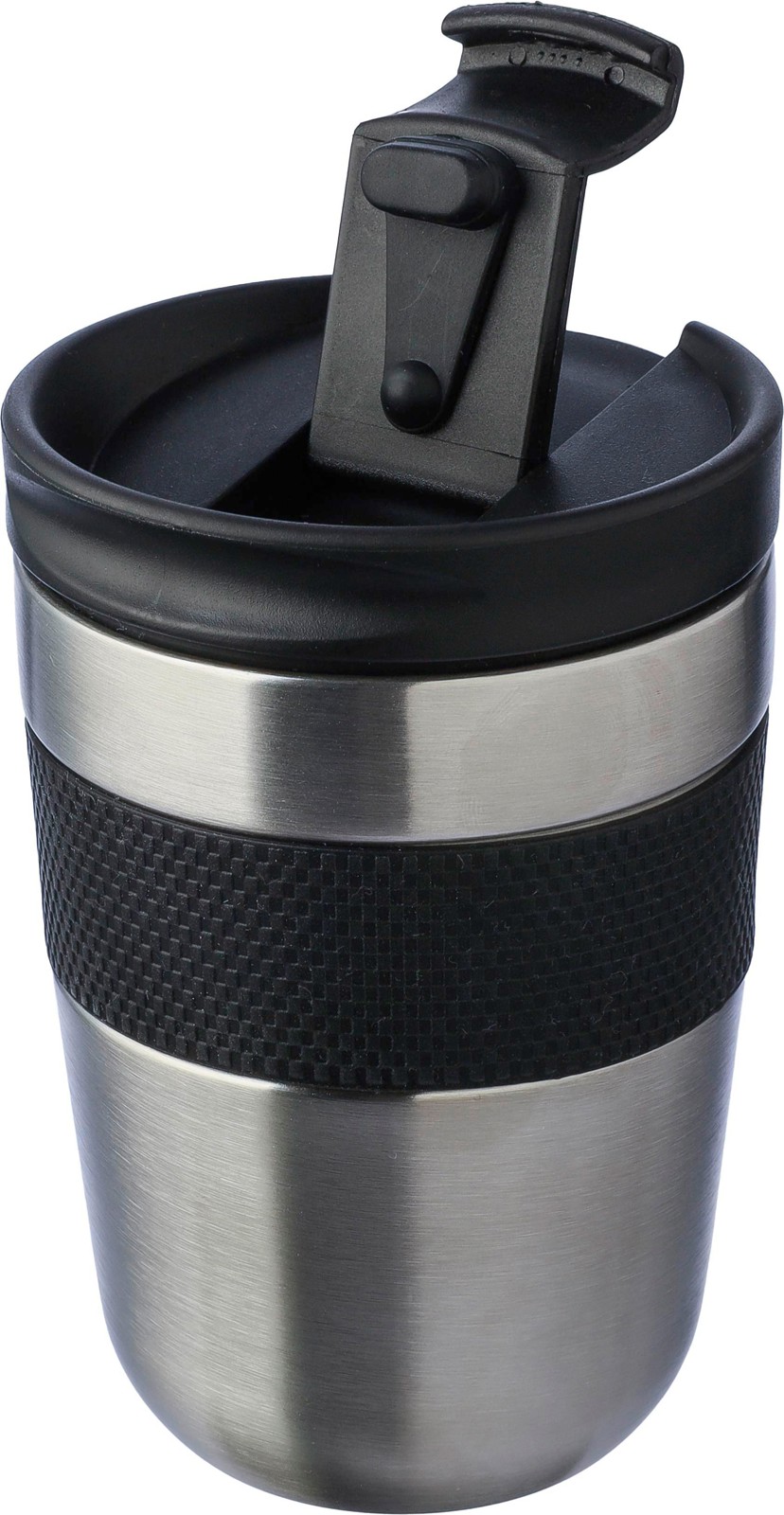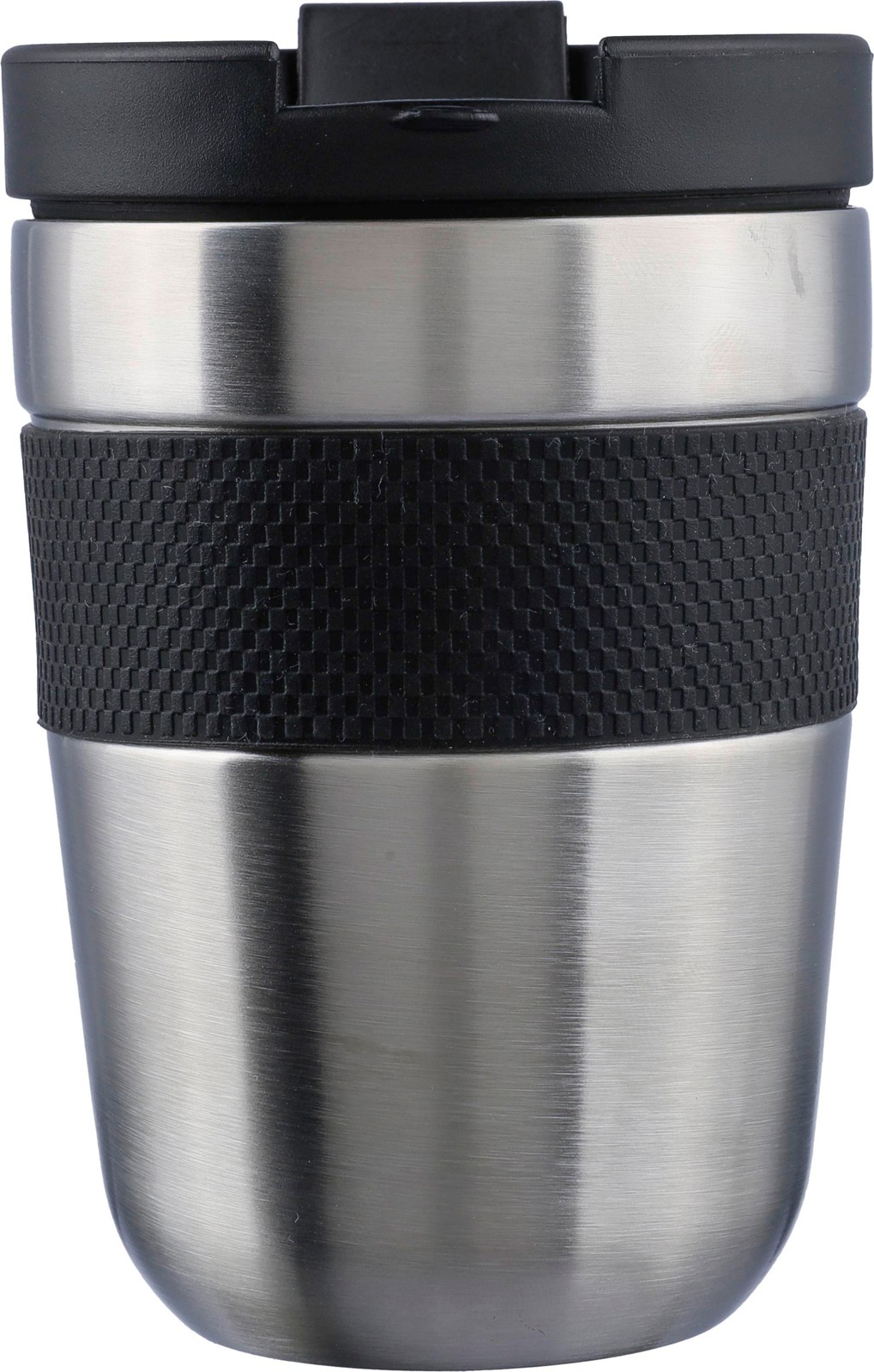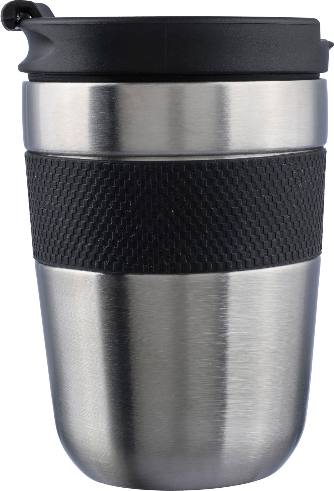 Copo de aço inoxidável de parede dupla (300 ml) com tampa em PP e pega em silicone. Mantém o conteúdo quente durante 4 horas e frio durante 6 horas. O interior é feito de aço inoxidável 304 e o exterior é de aço inoxidável 201. Apresentada individualmente numa caixa de cartão castanha.