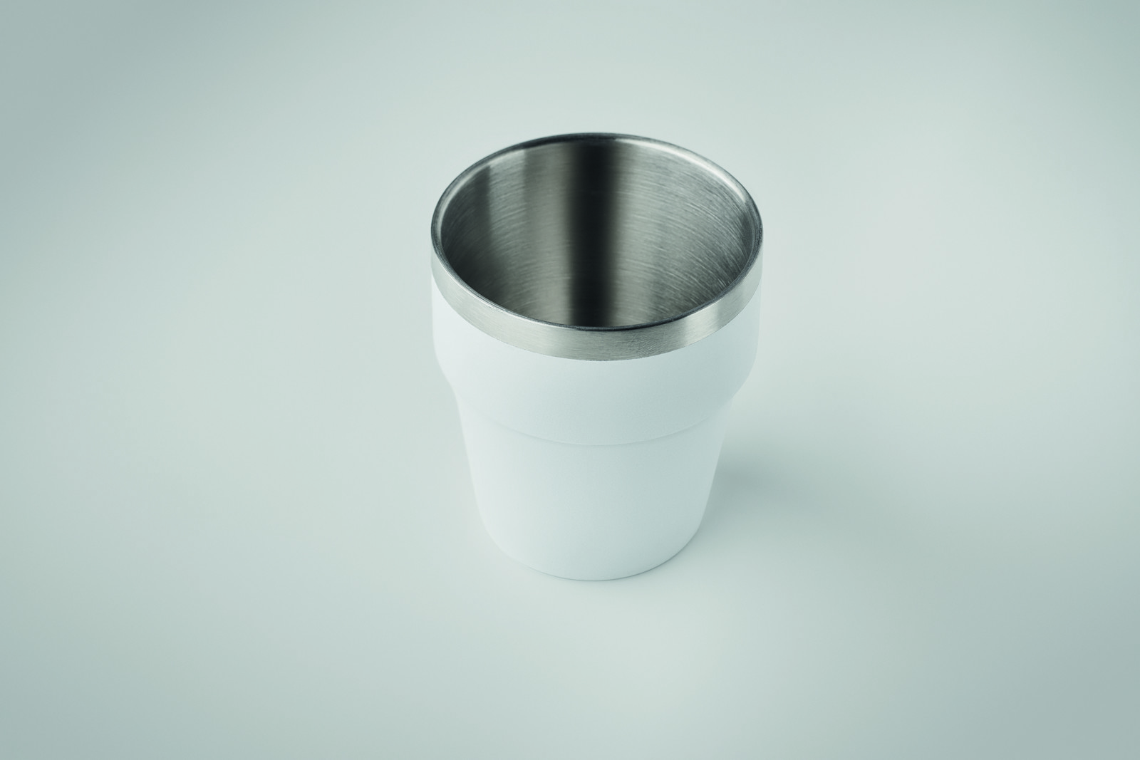 Copo de parede dupla em aço inoxidável reciclado (90% aço inoxidável reciclado e 10% aço inoxidável) Empilhável. Capacidade: 250 ml.