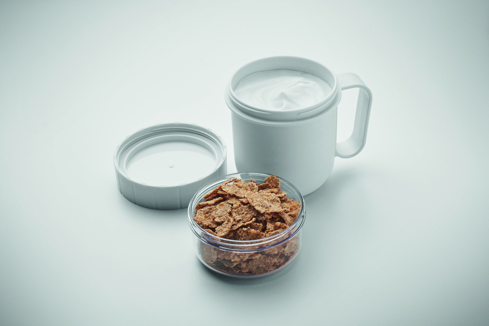 Chávena para o pequeno-almoço ou brunch em recipiente com tampa PP e PS. Composto por 2 recipientes individuais para manter os ingredientes separados. Capacidade: 450 ml e 160 ml. Sem fugas...
