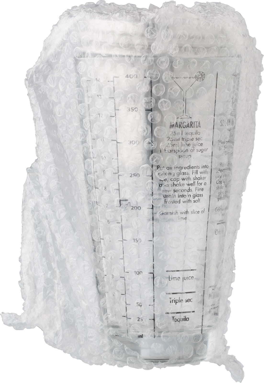 Coqueteleira de vidro (400 ml) com tampa de aço inoxidável (s/s304). Receitas de cocktails impressas na parte lateral. Apresentado individualmente numa caixa de cartão castanha.