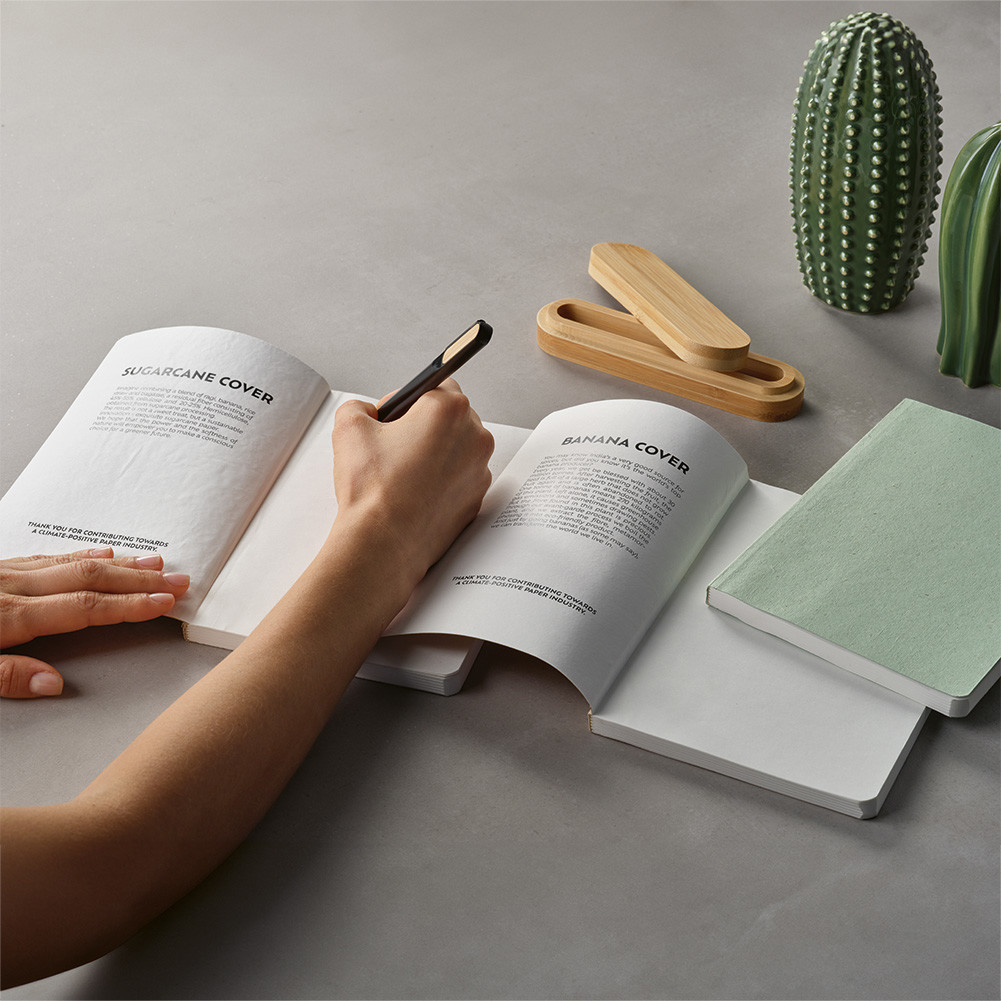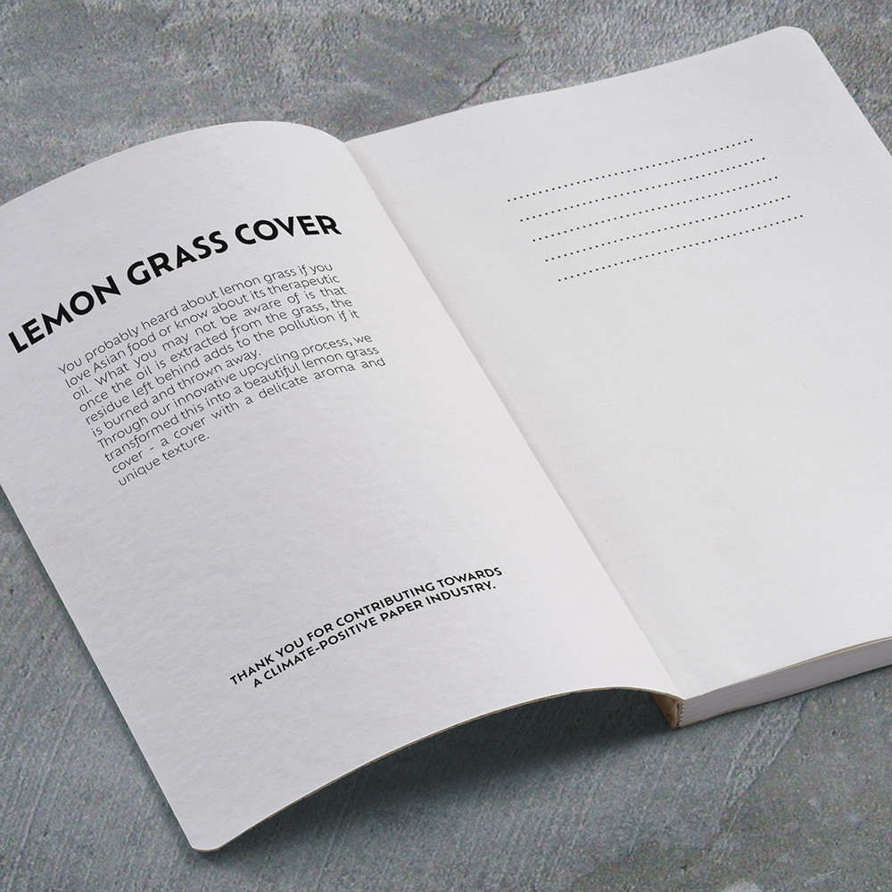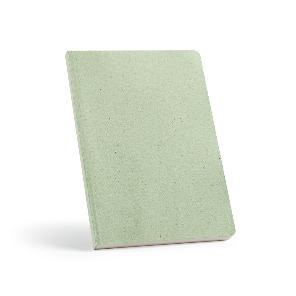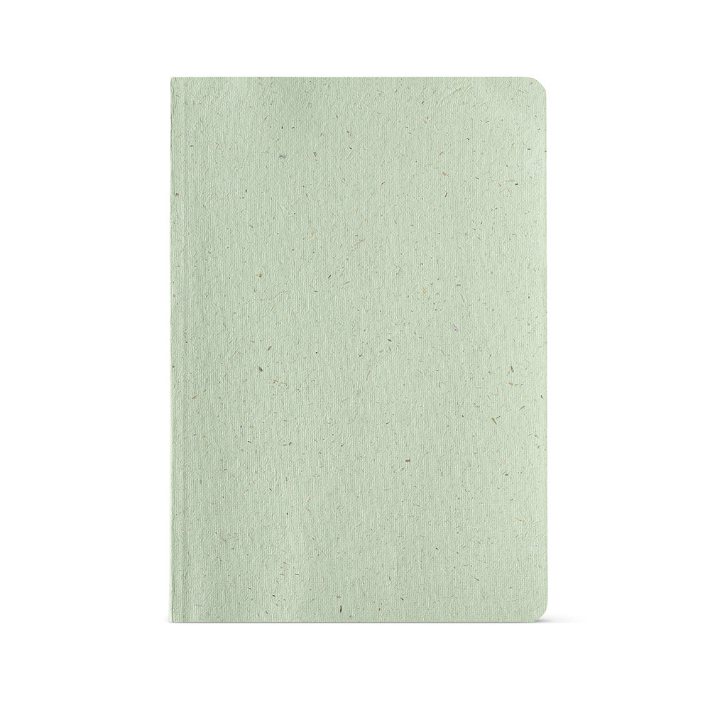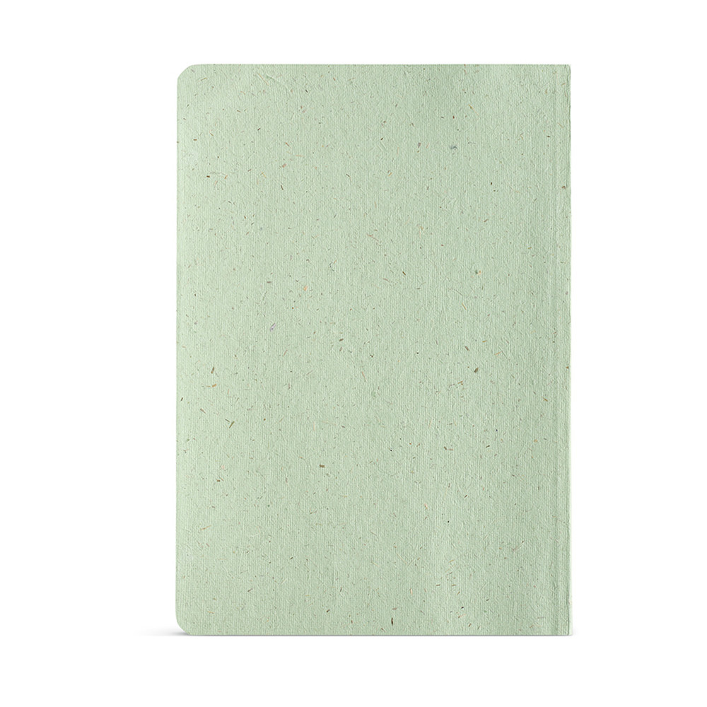 Caderno Dostoevsky A5, com capa de erva-príncipe, contém 196 páginas recicladas pontilhadas (80 gsm), com espaço designado para data e número de página, capa flexível e folha de rosto com storytelling. Fornecido numa manga individual de kraft.