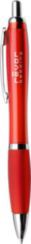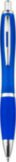 Esferográfica de plástico com clipe de metal e botão. Escrita azul.