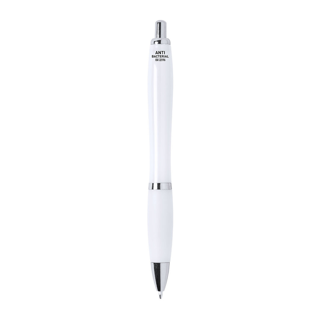Esferográfica anti-bacteriana. Fabricada em material ABS, especialmente tratado para inibir e prevenir o crescimento bacteriano sobre o corpo da esferográgica graças à tecnologia nano silver, um tratamento especial realizado com iões de prata. De mecanismo pulsador, com acessórios na cor prata e corpo na cor branca. Clip recortado e cómoda pega, em tinta azul. Artigo de acordo ao standart ISO 22196:2011, sobre a medida da actividade anti-bacteriana em plásticos e outras superfícies não porosas.