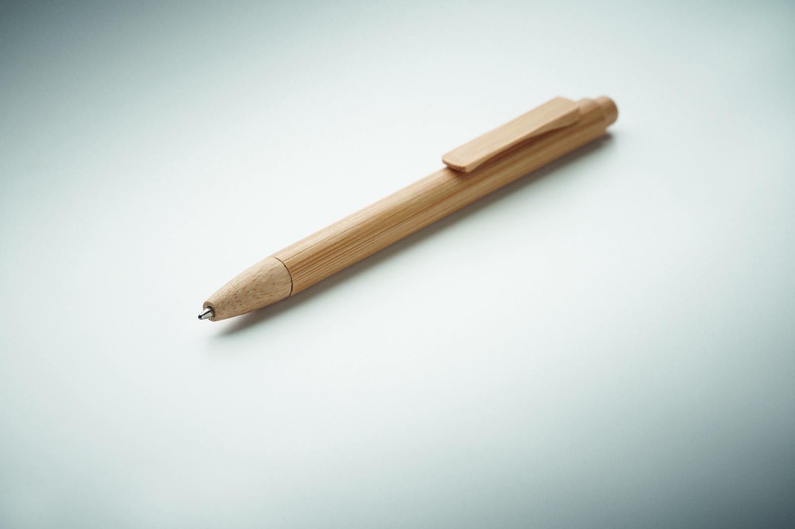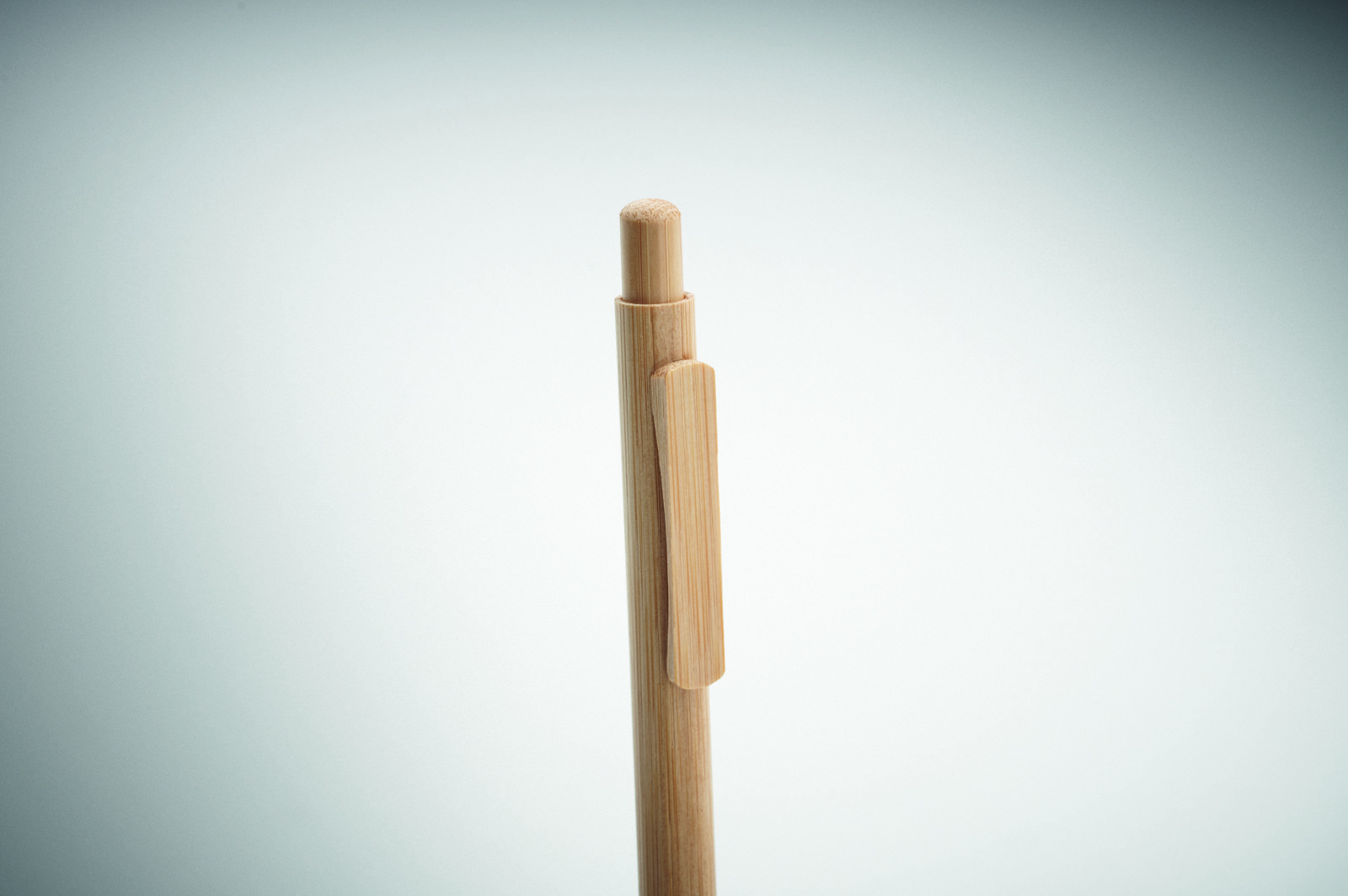 Caneta com botão de pressão com corpo, ponta, clipe e corpo em bambu. Tinta azul.