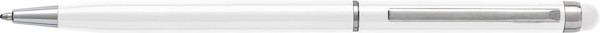 Elegante esferográfica com ponteiro táctil, corpo e detalhes em aluminio. Escrita azul.