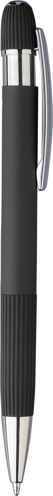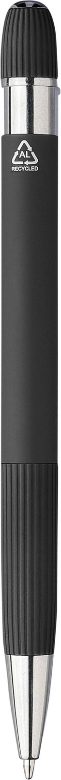 Esferográfica em alumínio reciclado com acabamento em borracha. Apresenta detalhes às riscas no punho e na parte superior, uma ponta de plástico cromado e um botão de pressão com clipe de metal. Inclui um logótipo reciclado gravado a laser. Tinta azul.