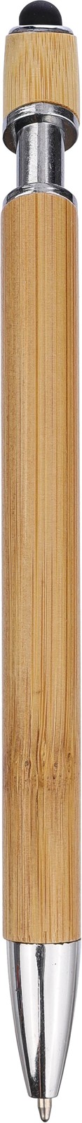 Esferográfica em bambu com pormenores em metal cromado. Ponta em plástico cromado e clipe em metal. Ponta colorida no botão de pressão. Aprox. 800 metros de comprimento de escrita. Tinta azul.