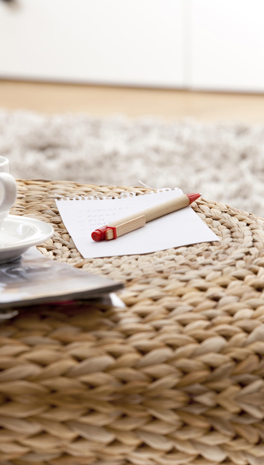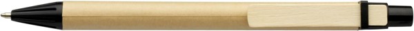Esferográfica com corpo de cartão, clip de madeira e botão em plástico. Escrita azul.