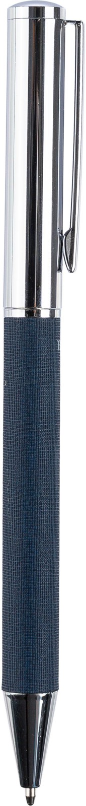 Esferográfica de torção em latão e rPET com clip e pega em metal. Possui um mecanismo de rotação e o logótipo rPET no corpo. Embalada individualmente numa caixa de cartão castanha. Tinta azul.