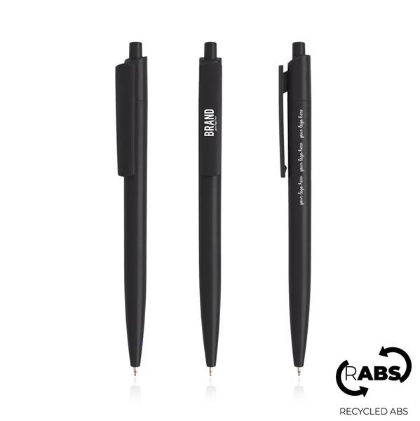 Esferográfica em ABS reciclado. Uma esferográfica reciclada, de design moderno, com clip largo e corpo uni-colorido. Esta esferográfica de sistema push tem escrita azul. Consulte também a versão de corpo branco e clip colorido 131543.