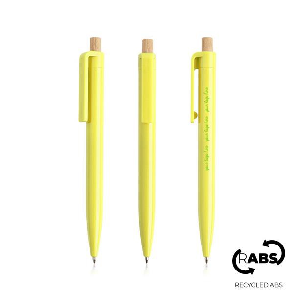 Esferográfica em ABS reciclado, detalhe em bambu. Uma esferográfica reciclada com cor única e botão em bambu. De sistema push e escrita azul, escolha um brinde que ajuda a divulgar a marca e ajuda o ambiente.