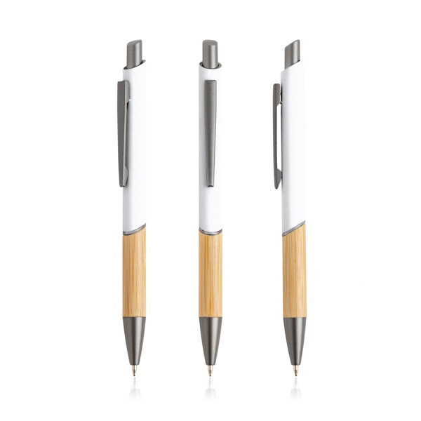 Esferográfica em alumínio reciclado. Ao comprar esta esferográfica, está a ajudar a reduzir o lixo que deriva da não reutilização. Esta esforográfica de escrita azul tem um design moderno, cruzando o metal reciclado com toque de borracha com a natureza do bambu.