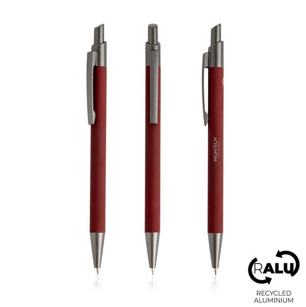 Esferográfica em alumínio reciclado, toque de borracha. Um brinde amigo do ambiente que oferece um design moderno, com o toque elegante de borracha. Esta esferográfica push vem com escrita preta.