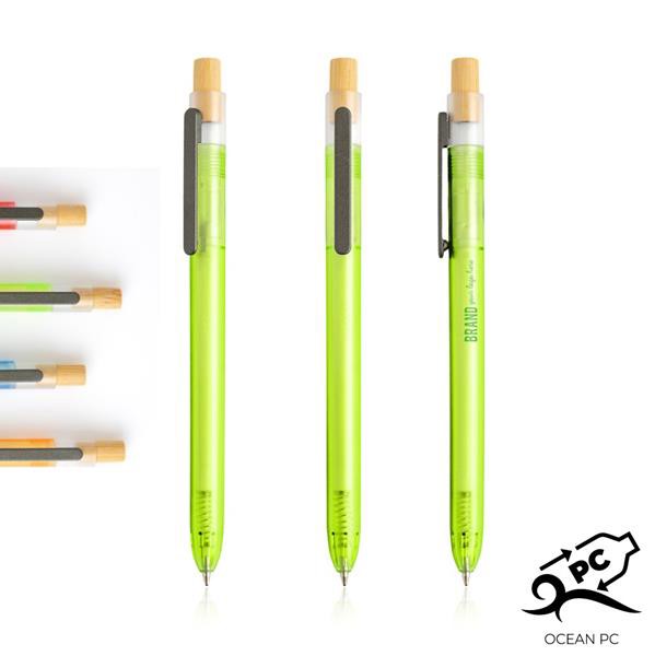 Esferográfica em PC dos oceanos, detalhe em bambu. Esferográfica em plástico reciclado dos oceanos, com corpo de cor translucida e botão em bambu. Esta esferográfica push vem com escrita azul. Consulte também a versão de corpo sólido131597.