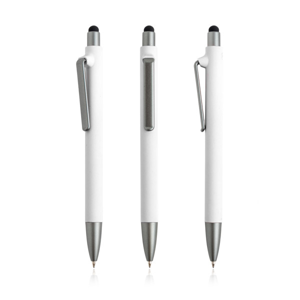 Esferográfica em PP dos oceanos, toque de borracha. Um brinde que junta a reutilização de materiais com o plástico reciclado e a elegância e suavidade do toque de borracha. Esta esferográfica com touch, numa variada gama de cores, tem sistema push e escrita azul.