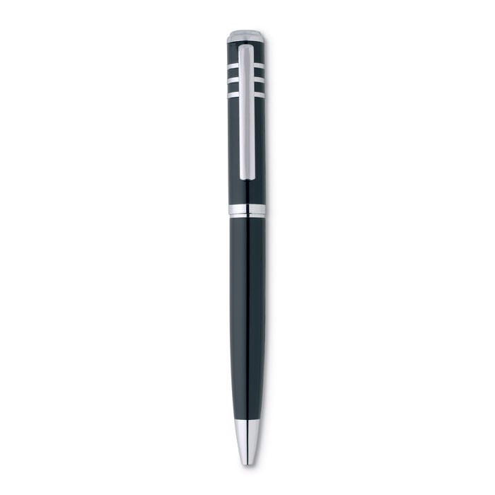 Esferográfica metálica com acabamento brilhante. Apresentado numa caixa de presente de cartão. Tinta preta.