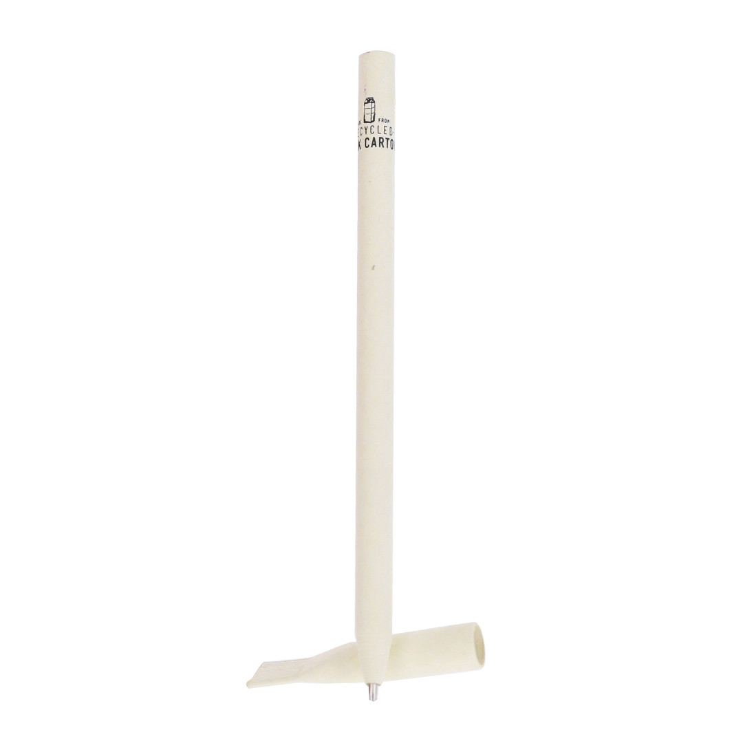 Caneta esferográfica com corpo fabricado com caixas de leite recicladas e detalhes em cor branca. Com fechamento de tampa e tinta azul, com distintivo de papel de leite reciclado no corpo.As caixas de leite são compostas em sua maior parte por papelão e alumínio. Durante seu processo de reciclagem, os diferentes materiais da embalagem são separados para reutilização e novo uso, contribuindo assim para o caminho infinito da economia circular. Esse material se caracteriza por seu alto grau de reciclabilidade, bem como por sua leveza e resistência.