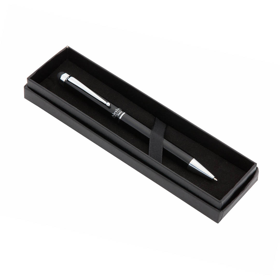 Esferográfica ponteiro de Alexluca de mecanismo giratório com suave corpo metálico de elegante cor preta. Clip e ponteiro a condizer. Apresentado em estojo individual preto com logotipo da marca. Tinta azul.