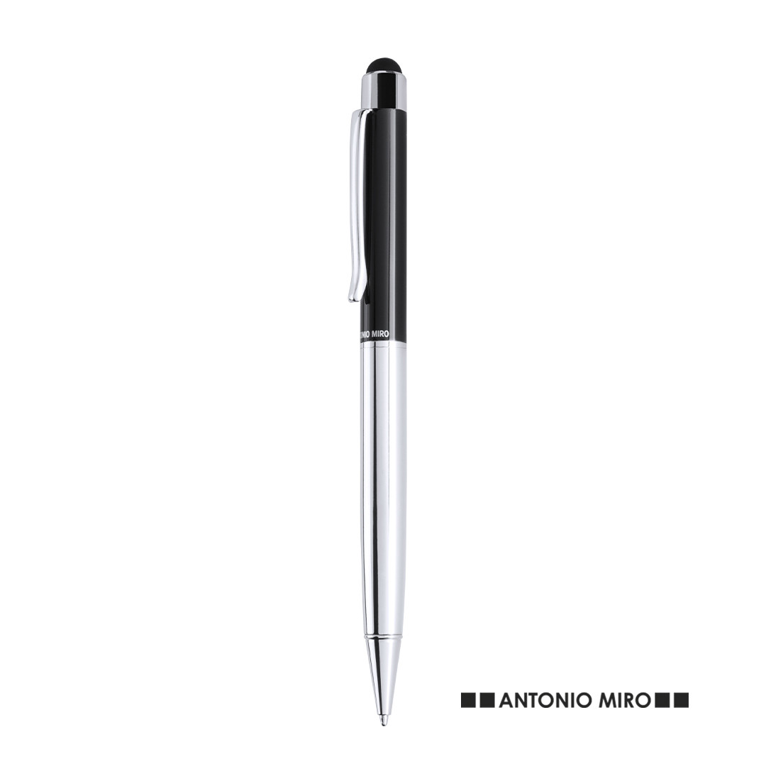 Esferográfica ponteiro de António Miró de mecanismo giratório com suave corpo metálico, de elegante combinação de cores prata e preto. Apresentado em caixa individual de cor preta com logotipo da marca. Tinta azul.