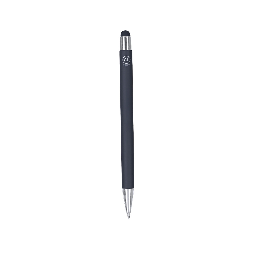 Caneta marcador de mecanismo de botão fabricada em alumínio reciclado. Botão e clip metálico com acabamento cromado, acabamento em marcador à jogo. Corpo com finalização em borracha, especialmente projetado para marcação a laser. Distintivo alumínio reciclado na parte superior da caneta. De cartucho jumbo e em tinta azul. O alumínio reciclado é um material com possibilidades de reciclagem quase infinitas, sem perder suas propriedades originais e consumindo menos energia nesse processo.Certificação GRS (Global Recycled Standard / Padrão de Reciclagem Global), que garante a origem reciclada do material usado para fabricar o produto. Carga Jumbo
