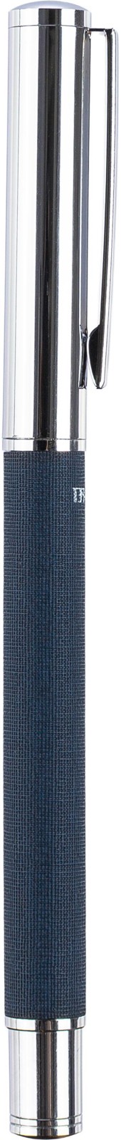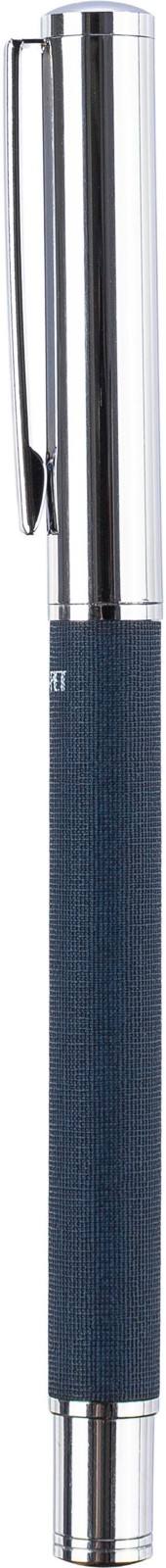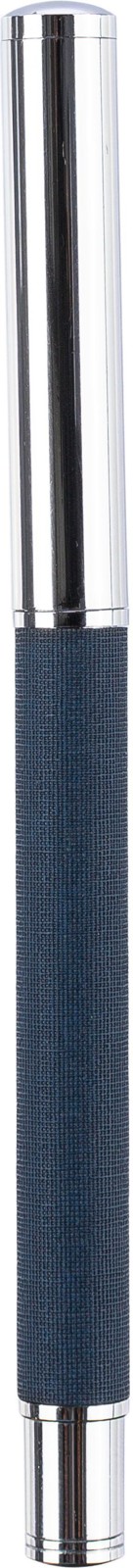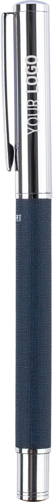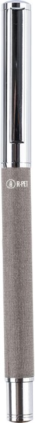 Esferográfica rollerball em latão e rPET com clip e pega em metal. Possui um mecanismo deslizante e o logótipo rPET no corpo. Embalada individualmente numa caixa de cartão castanha. Tinta azul.