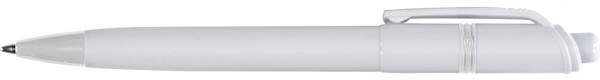 Esferográfica Stilolinea de plástico com corpo branco, ponta e anel coloridos. Escrita azul. Fornecida com tinta Dokumental alemã.