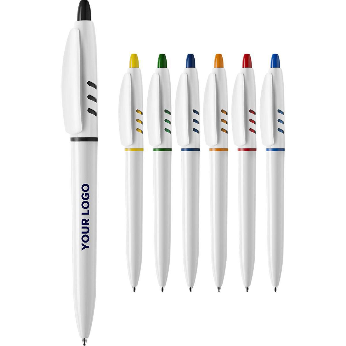 Esferográfica Stilolinea de plástico com corpo branco, anel, botão e detalhes coloridos. Escrita azul. Fornecida com tinta Dokumental alemã.