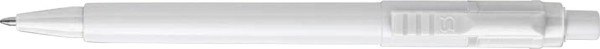 Esferográfica Stilolinea de plástico, com corpo branco, clip colorido e recarga jumbo. Escrita azul. Fornecida com tinta Dokumental alemã.