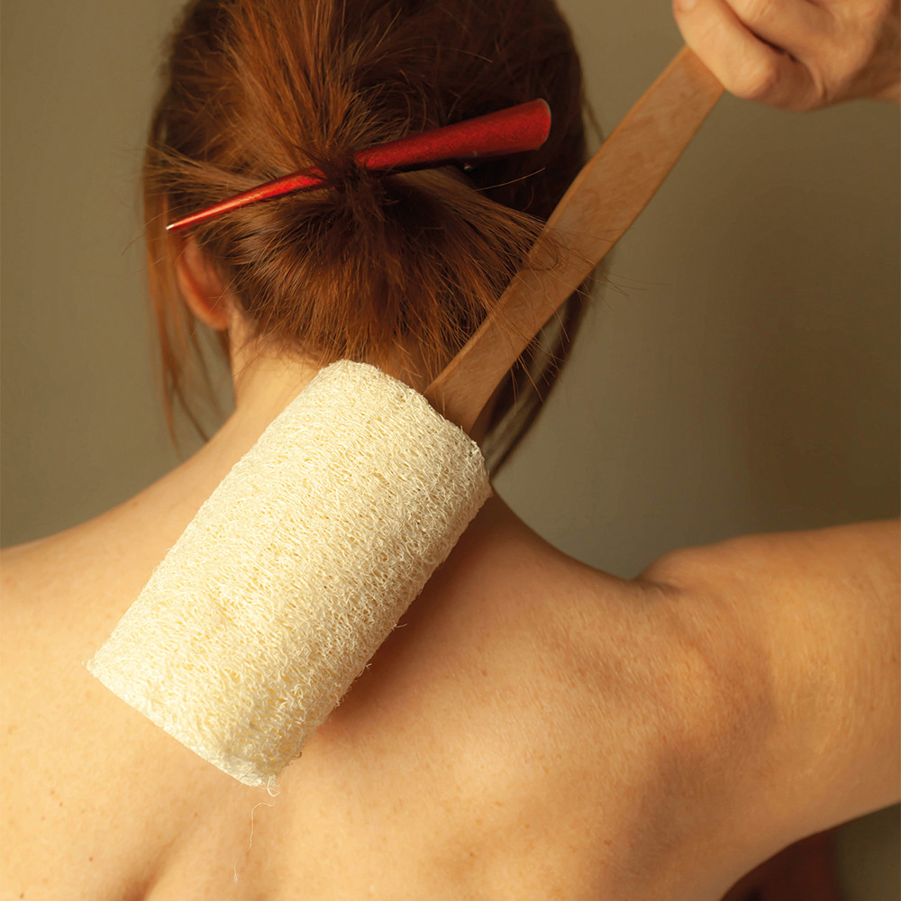 Esponja natural Loofah Scrub com pega de madeira e corda para seu fácil uso.
