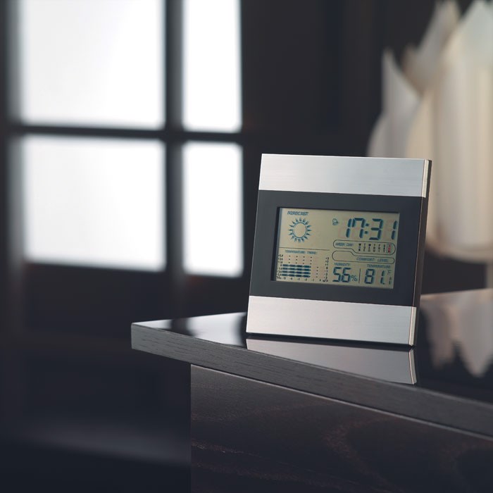 Estação meteorológica em prata e preto. Inclui relógio, termómetro, higrómetro e calendário. 2 pilhas AAA não incluídas.