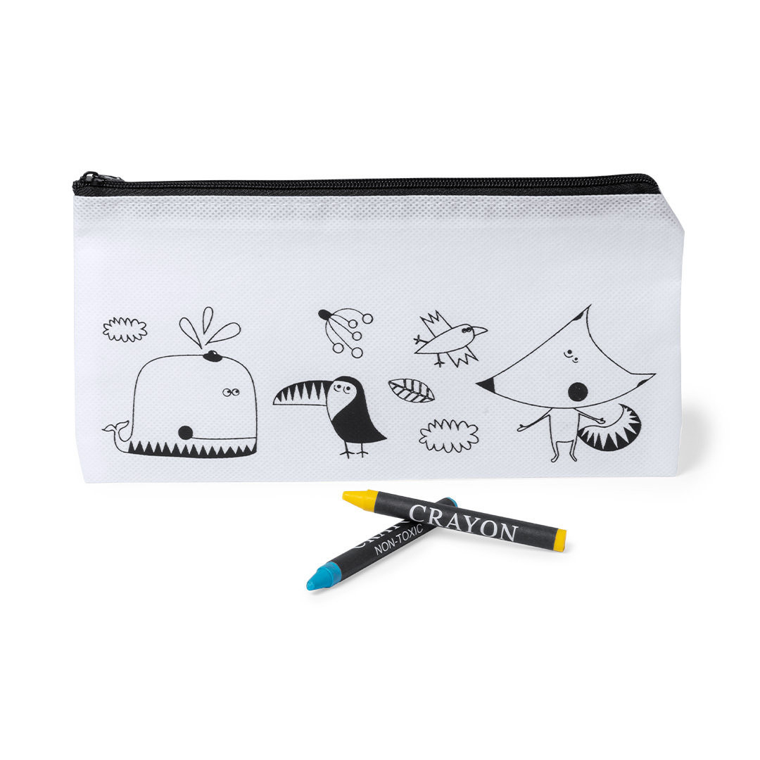 Case não tecida branca especialmente projetada para colorir com giz de cera. Inclui 5 giz de cera do corpo cilíndrico em cores variadas. Com fechamento de zíper preto. 5 Ceras Incluídas