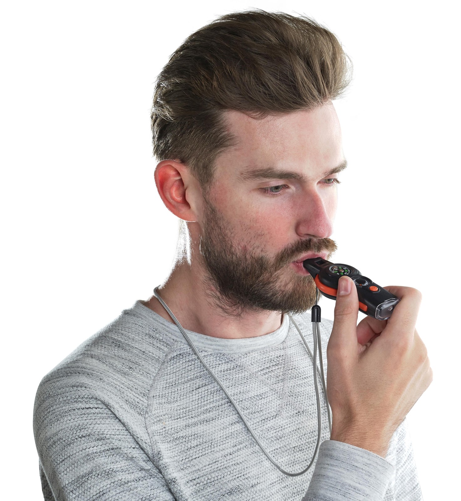 Ferramenta multifuncional para aventureiros. Inclui apito, bússola, termômetro (° F), lanterna, espelho, lupa e cabo com trava de segurança.