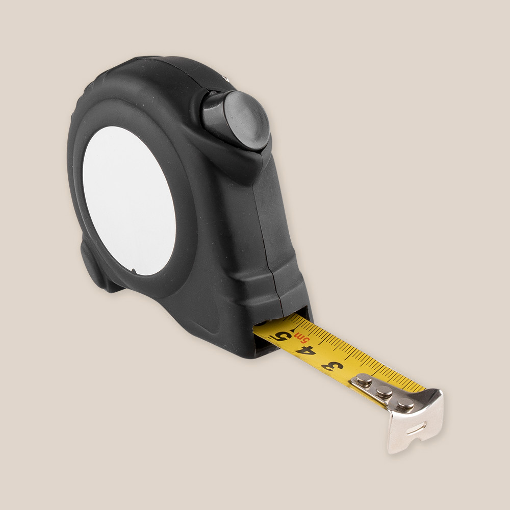 Fita métrica em ABS com 5 mts, acabamento em borracha de cor preta. Com clip para pendurar.