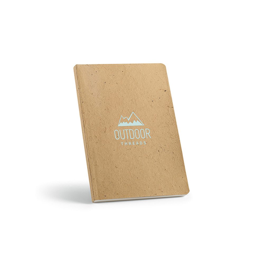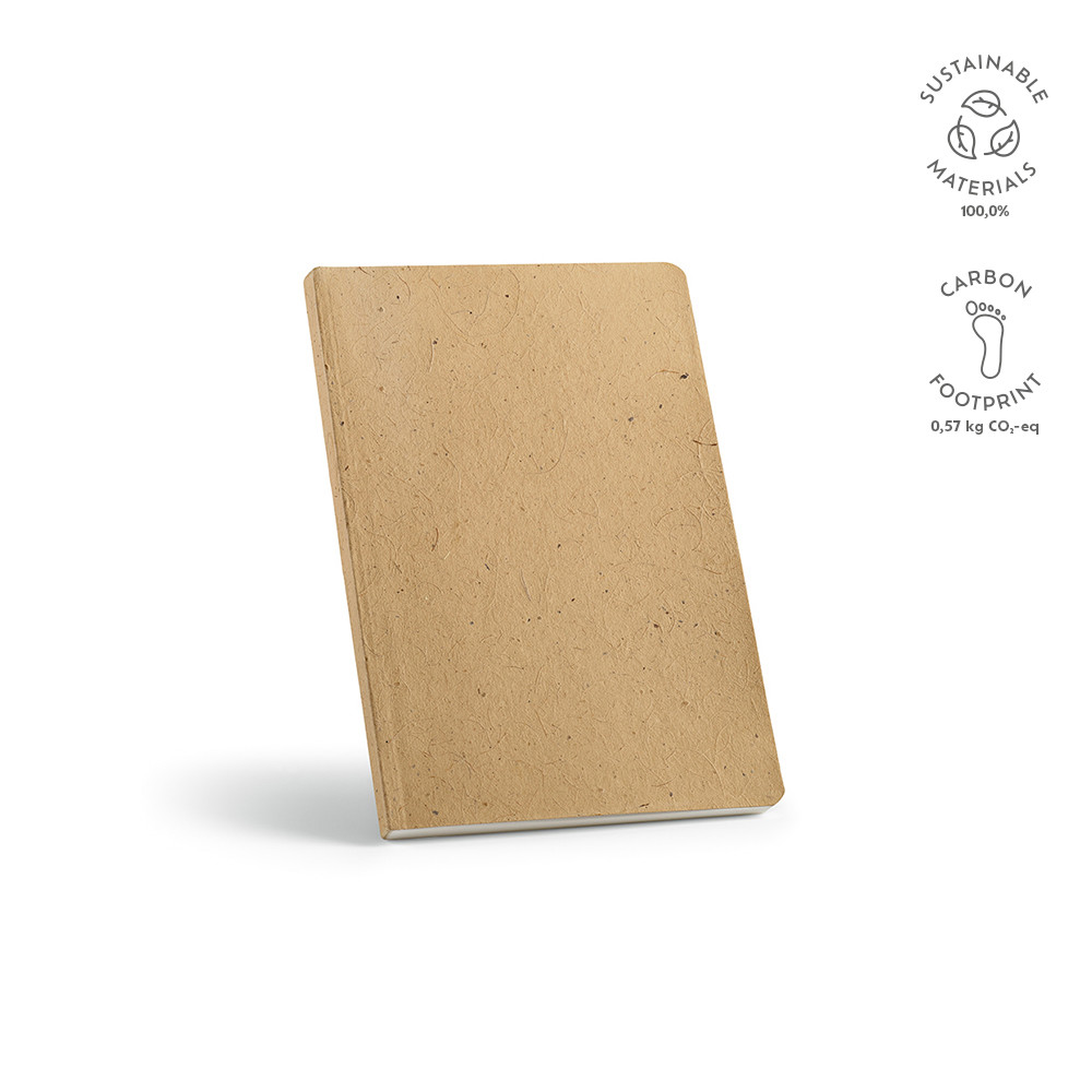 Caderno Fitzgerald A5, com capa de casca de coco (60% casca de coco e 40% pano de algodão), inclui 196 páginas recicladas pontilhadas (80 gsm), com secção para data e número de página, em capa flexível. A folha de rosto realça uma história única. Fornecido numa manga individual de kraft.