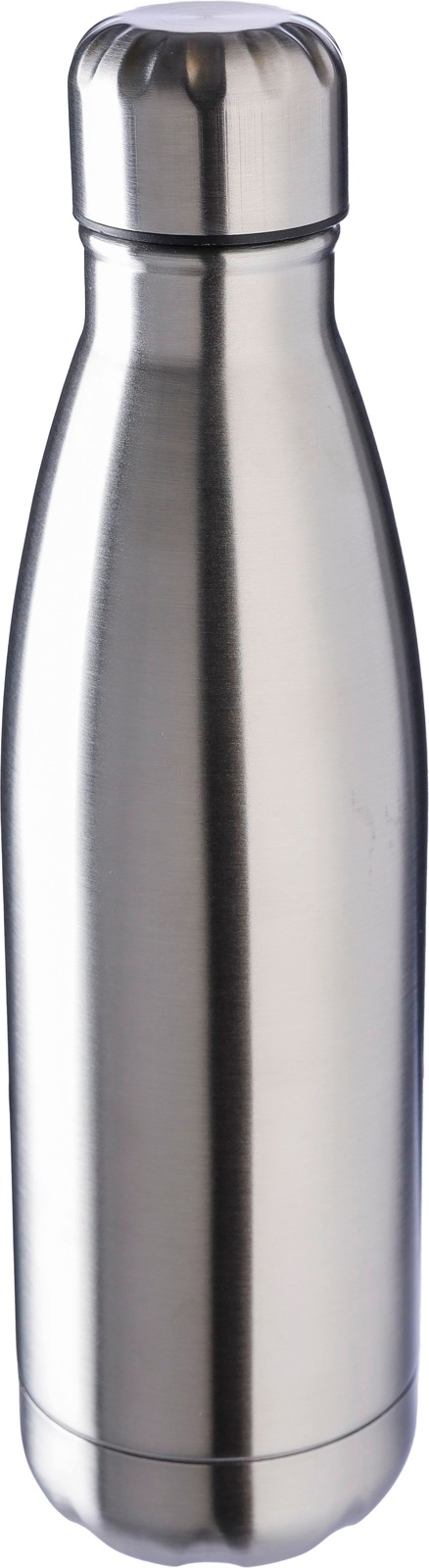 Garrafa de parede dupla em aço inoxidável reciclado (500 ml) com tampa de rosca. O interior é feito de aço inoxidável 304 e o exterior de aço inoxidável 201. Logótipo reciclado gravado no frasco. Apresentado individualmente numa caixa de cartão castanha.