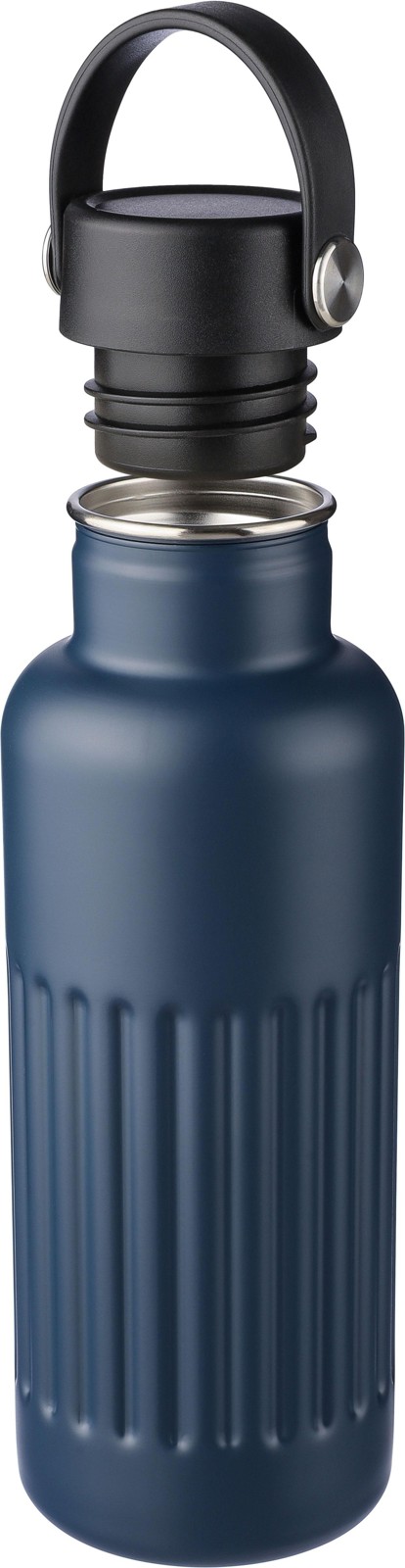 Garrafa de bebida em aço inoxidável reciclado (500 ml). O interior é feito de aço inoxidável 304 e o exterior é de aço inoxidável 201 com um desenho de pega em arco. Possui uma tampa em PP e ferro com uma pega em TPE para facilitar o transporte. Inclui um logótipo reciclado gravado no recipiente. Embalado individualmente numa caixa de cartão castanha.