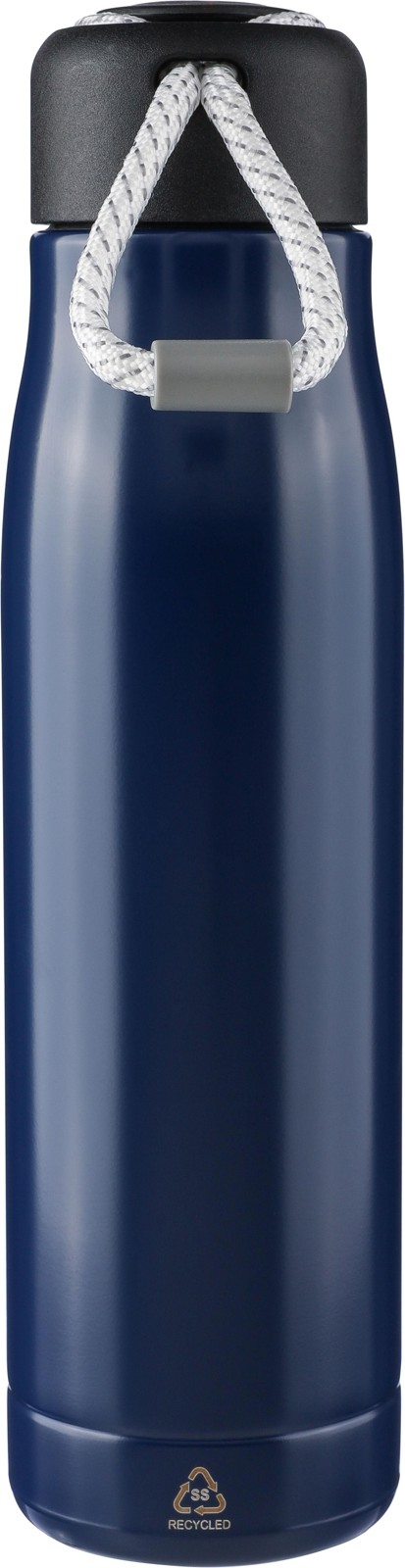 Garrafa térmica de parede dupla em aço inoxidável reciclado (500 ml) com um interior em aço inoxidável 304 e um exterior em aço inoxidável 201. Possui uma tampa de rosca em PP e um cordão de transporte em poliéster. Concebida para isolamento e utilização quotidiana. Inclui um logótipo reciclado gravado. Embalada individualmente numa caixa de cartão castanha.