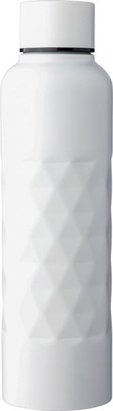 Garrafa de aço inoxidável reciclado de parede simples (800 ml) fabricada em aço inoxidável 304. Apresenta uma textura em forma de losango no corpo, tampa de rosca e um logótipo reciclado gravado a laser. Embalada individualmente numa caixa de cartão castanha.