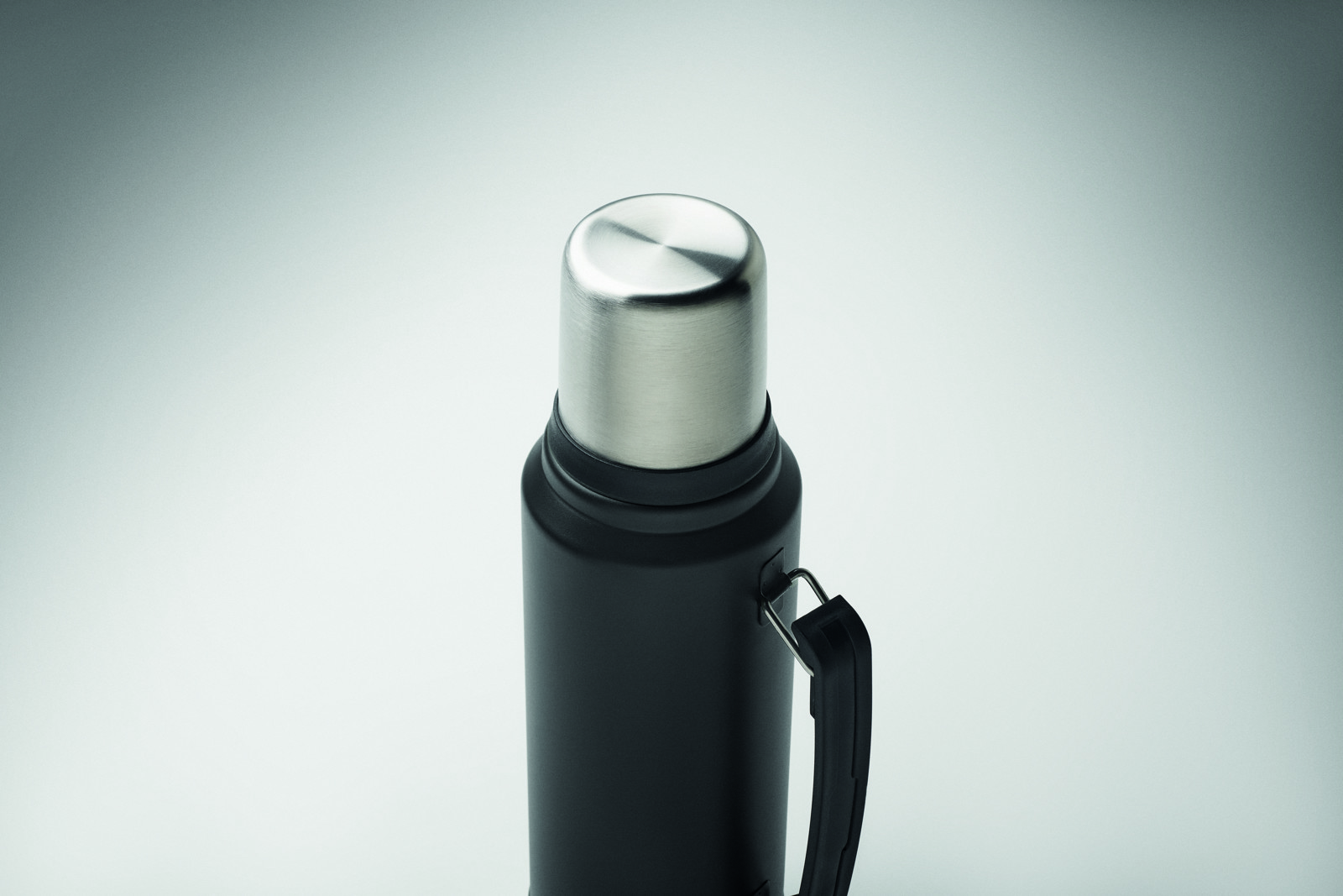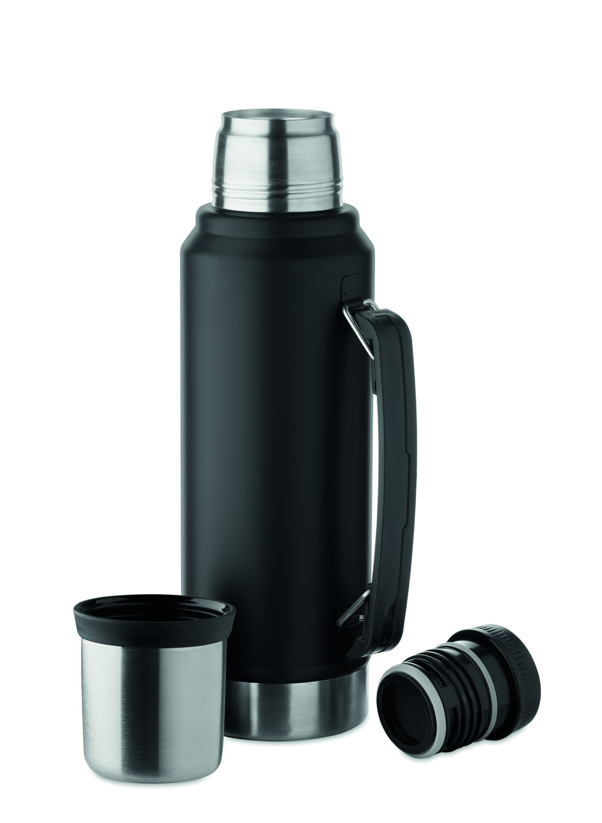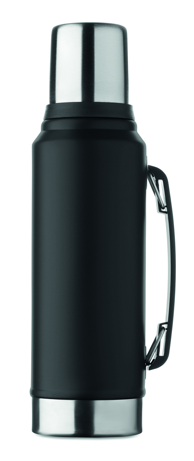Garrafa de parede dupla isolada a vácuo feita de aço inoxidável reciclado (90% aço inoxidável reciclado e 10% aço inoxidável) com pega lateral. Com tampa em PP e copo em aço inoxidável reciclado. Sem fugas. Capacidade: 1L.