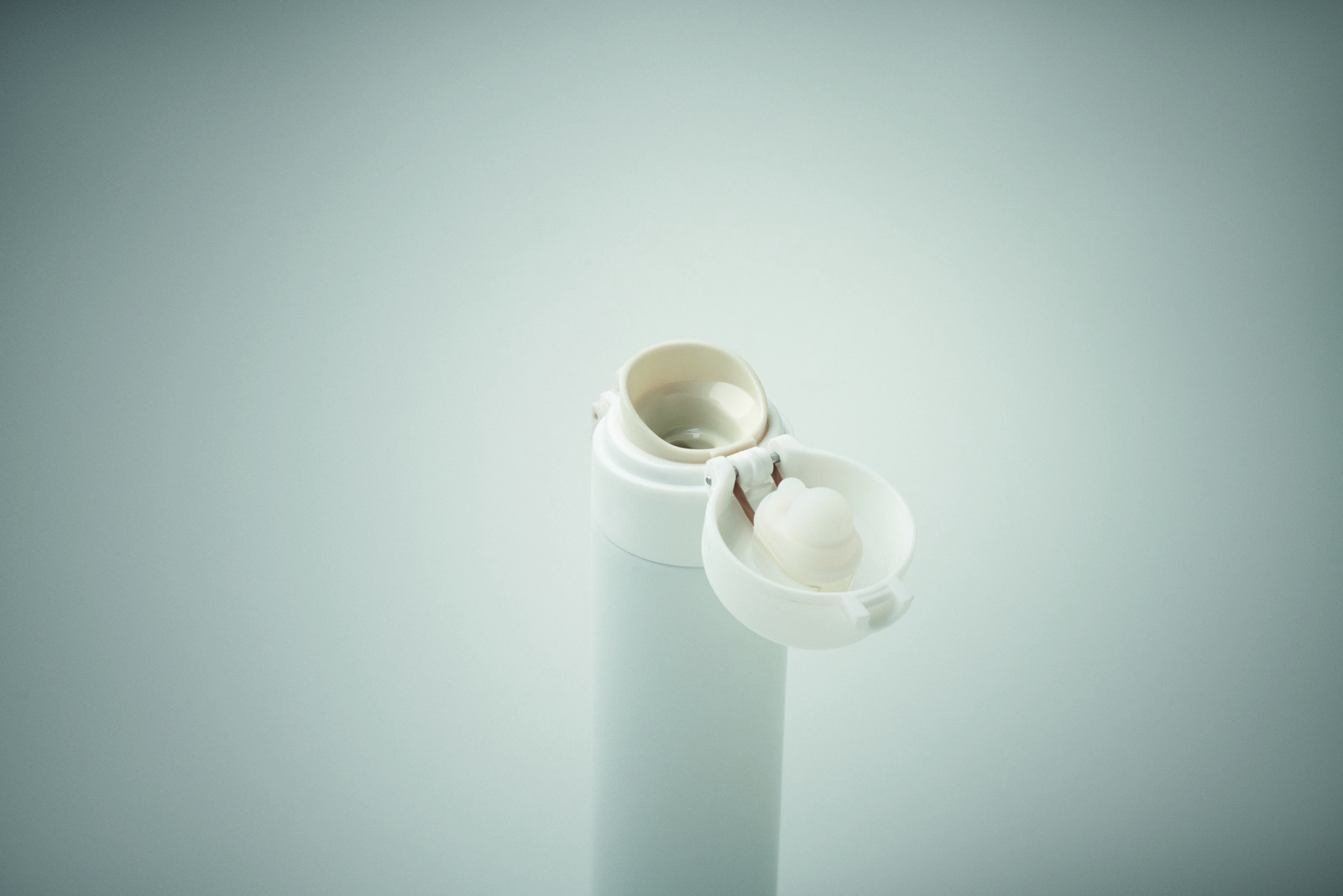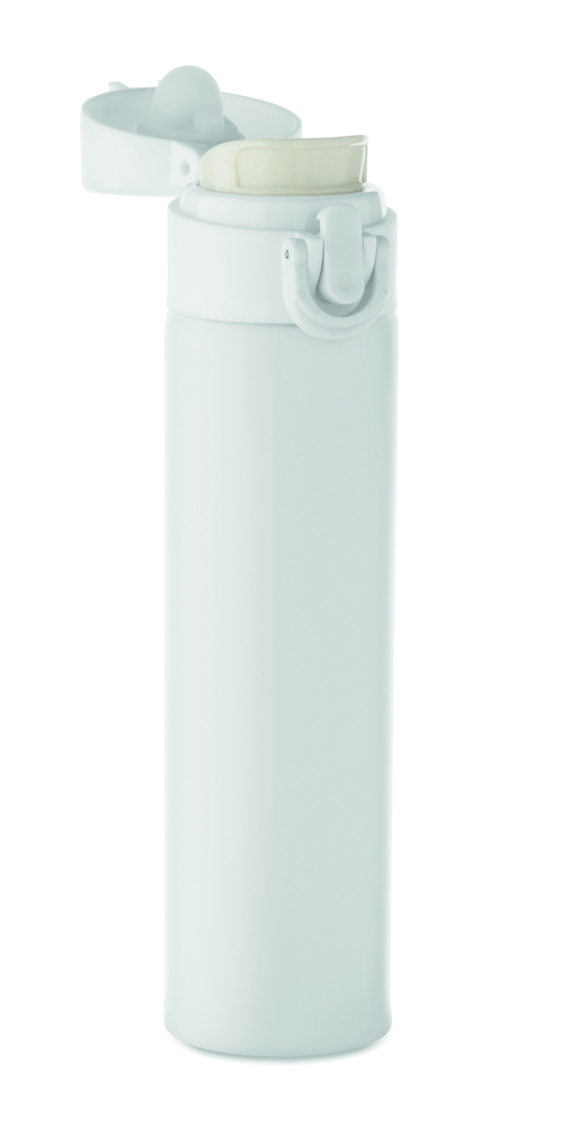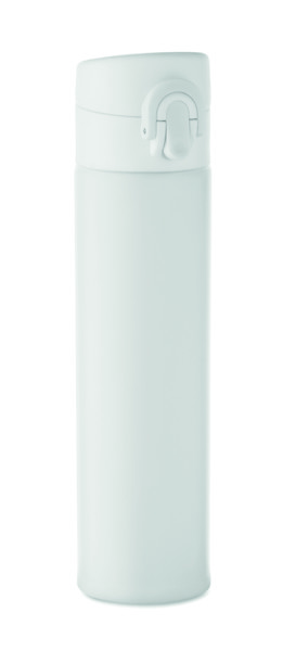 Garrafa de parede dupla em aço inoxidável reciclado (90% aço inoxidável reciclado e 10% aço inoxidável) com fecho de segurança na tampa e opção de abertura por pressão. Sem fugas. Capacidade: 300 ml.