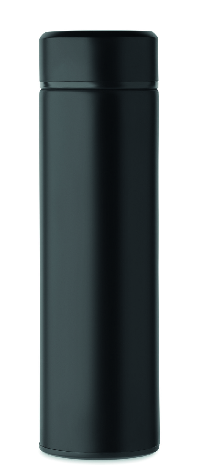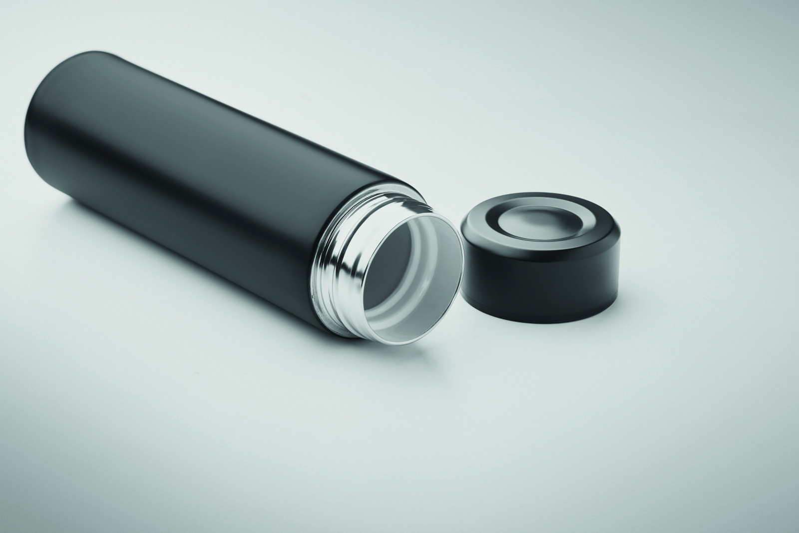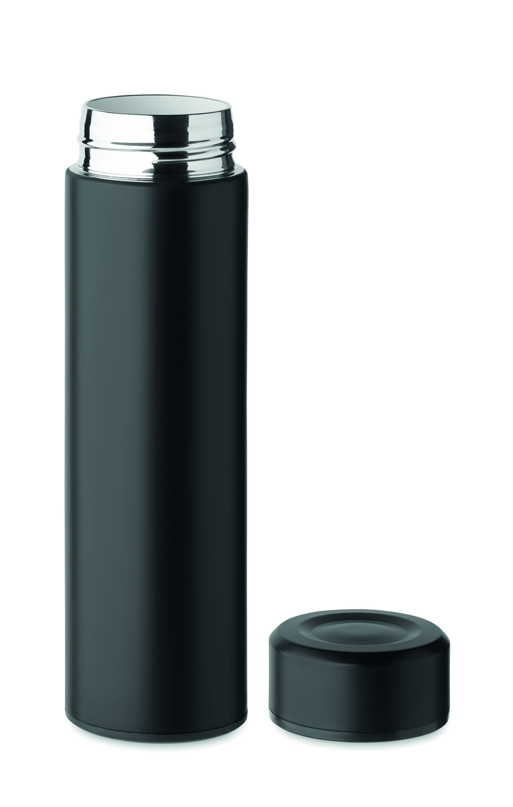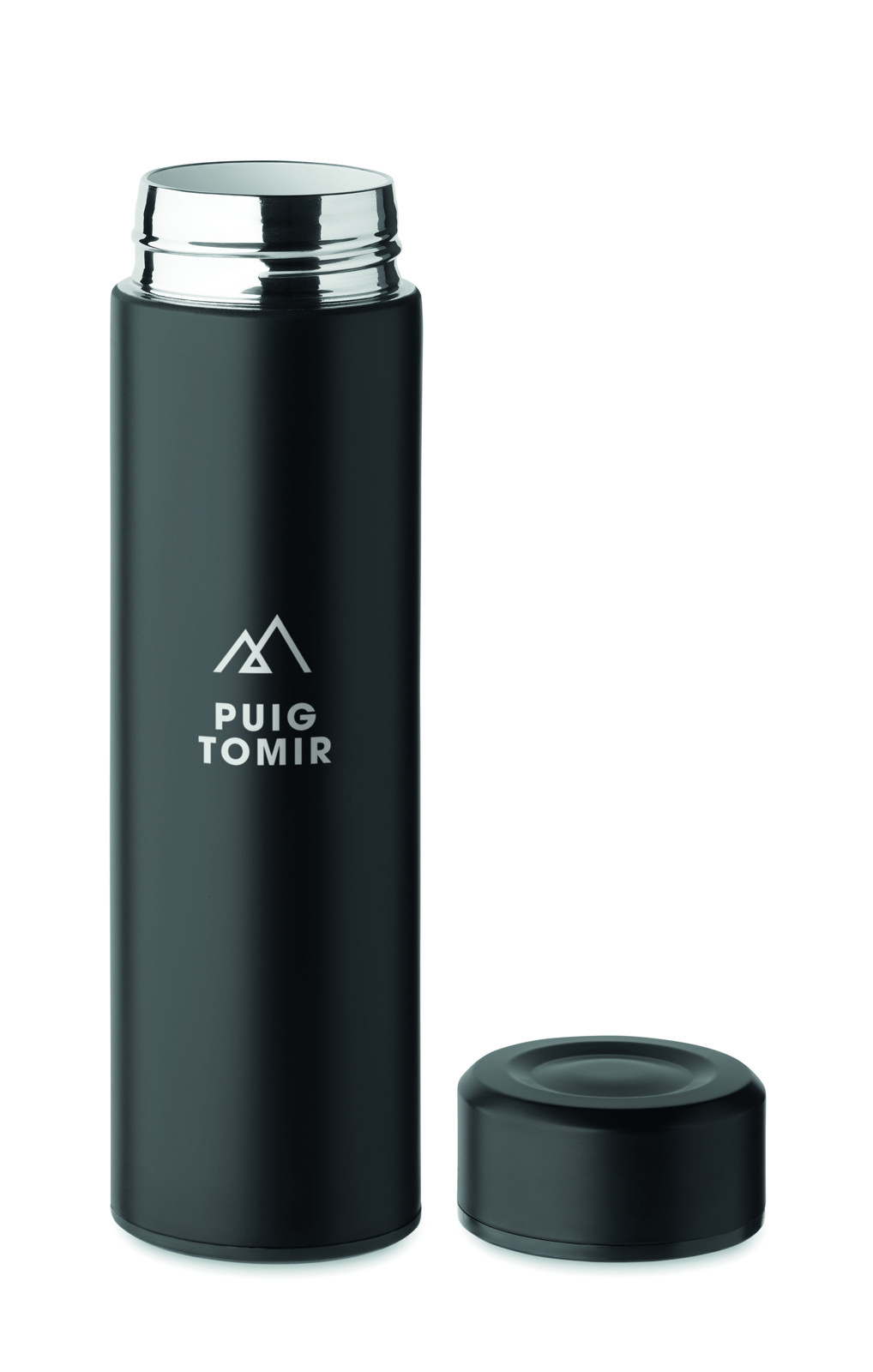 Garrafa isolante a vácuo de parede dupla em aço inoxidável reciclado (90% aço inoxidável reciclado e 10% aço inoxidável) com camada interior de cerâmica. Capacidade: 420 ml.