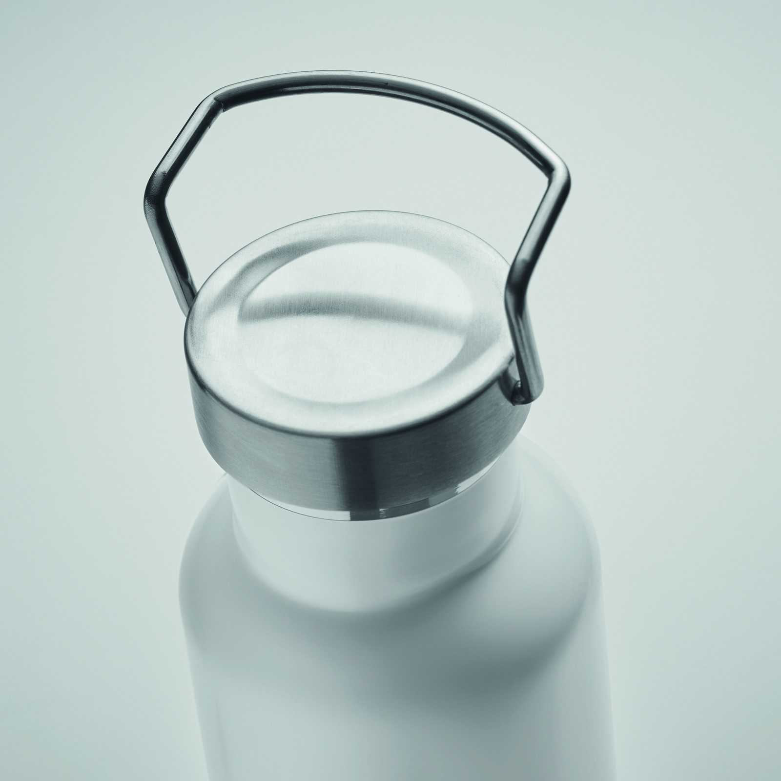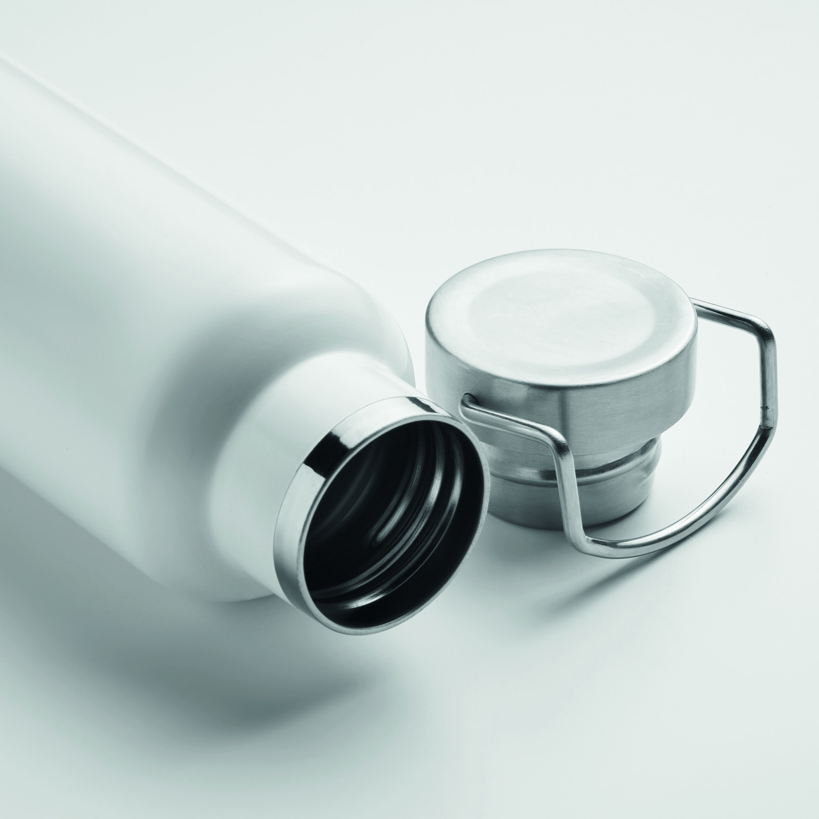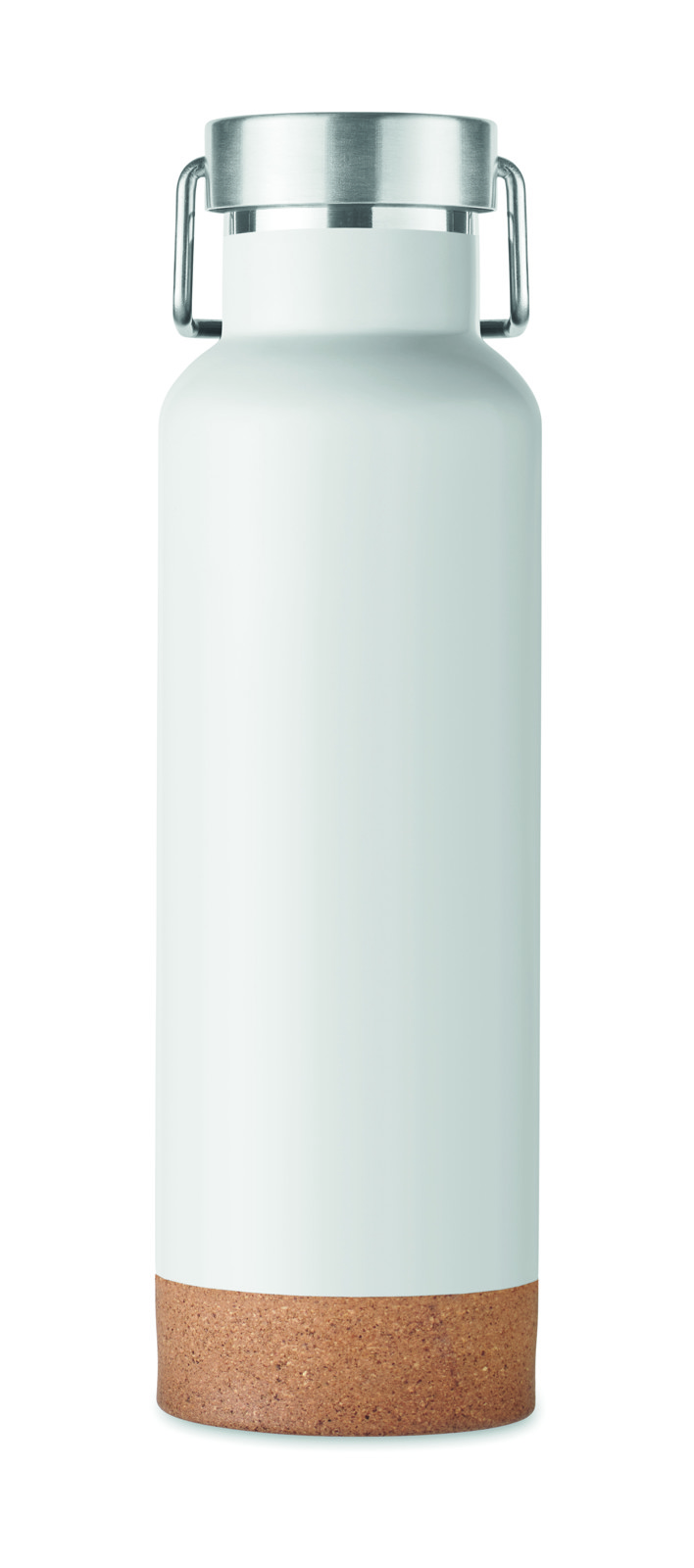 Garrafa de parede dupla isolada a vácuo feita de aço inoxidável reciclado com uma tampa com pega e base com pormenor de cortiça. À prova de fugas. Capacidade: 500 ml. (90% aço inoxidável reciclado e 10% aço inoxidável).