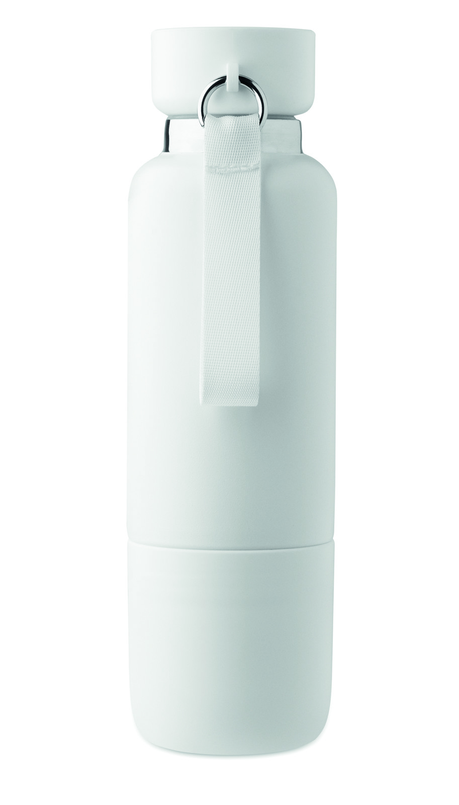 Garrafa isolada de parede dupla em aço inoxidável 90% reciclado e 10% em aço inoxidável, com pega de alça integrada e alça longa adicional (70 cm) na tampa em PP. Sem fugas. Copo inferior incluído. Capacidade: 500 ml.