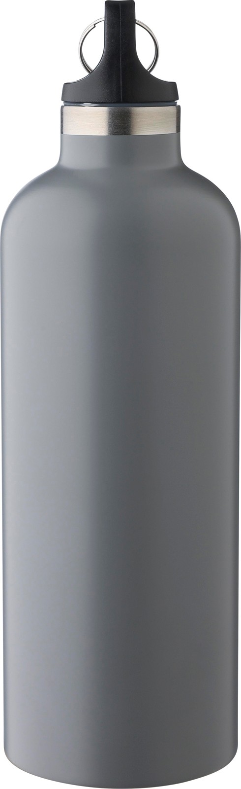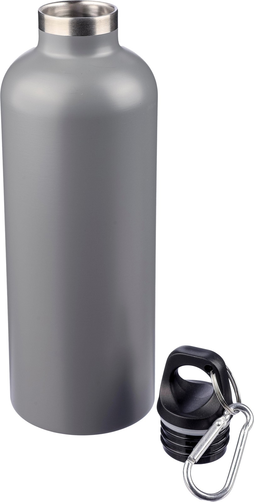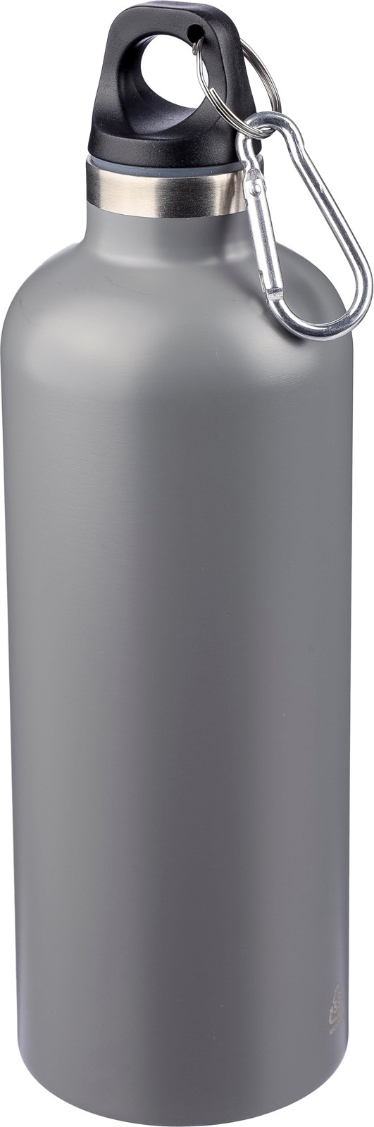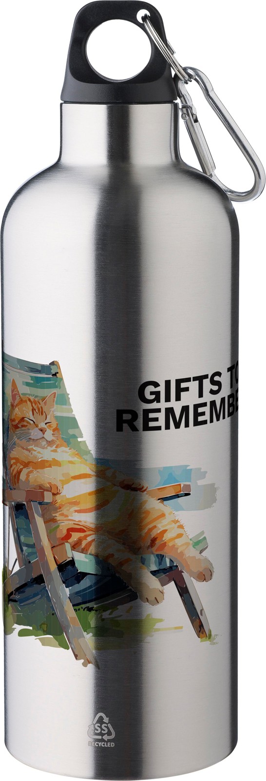 Garrafa de parede dupla em aço inoxidável (s/s304) reciclado com uma capacidade de 500 ml, tampa em PP e mosquetão de alumínio. Mantém as bebidas quentes durante 8 horas e frias durante 12 horas. A garrafa tem um acabamento mate (exceto a prateada) e inclui um logótipo reciclado a laser. Embalada individualmente numa caixa de cartão castanha.