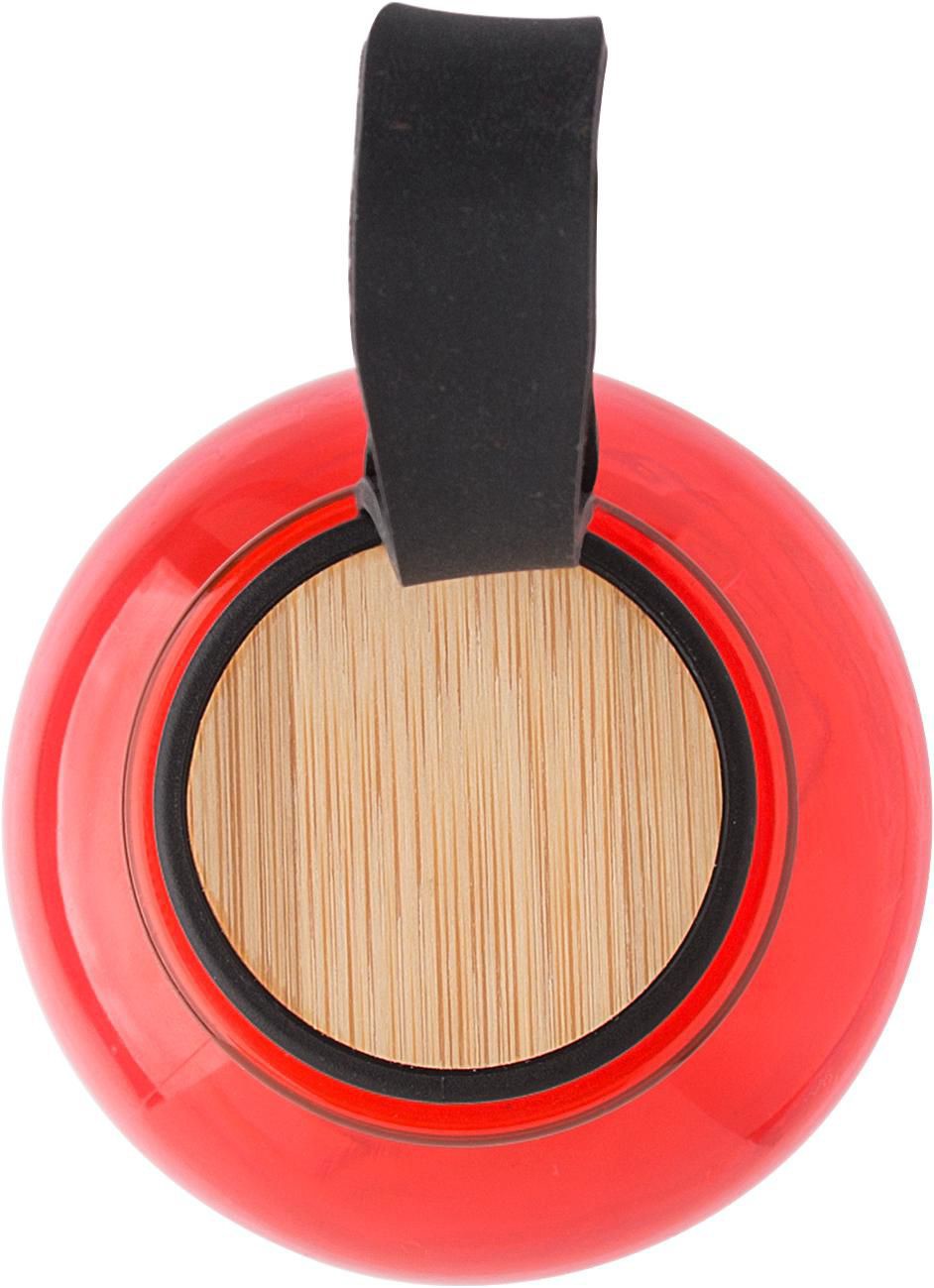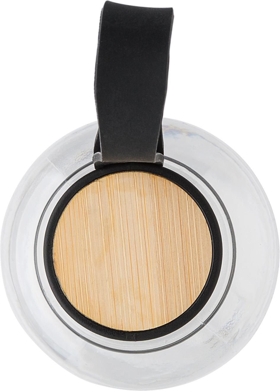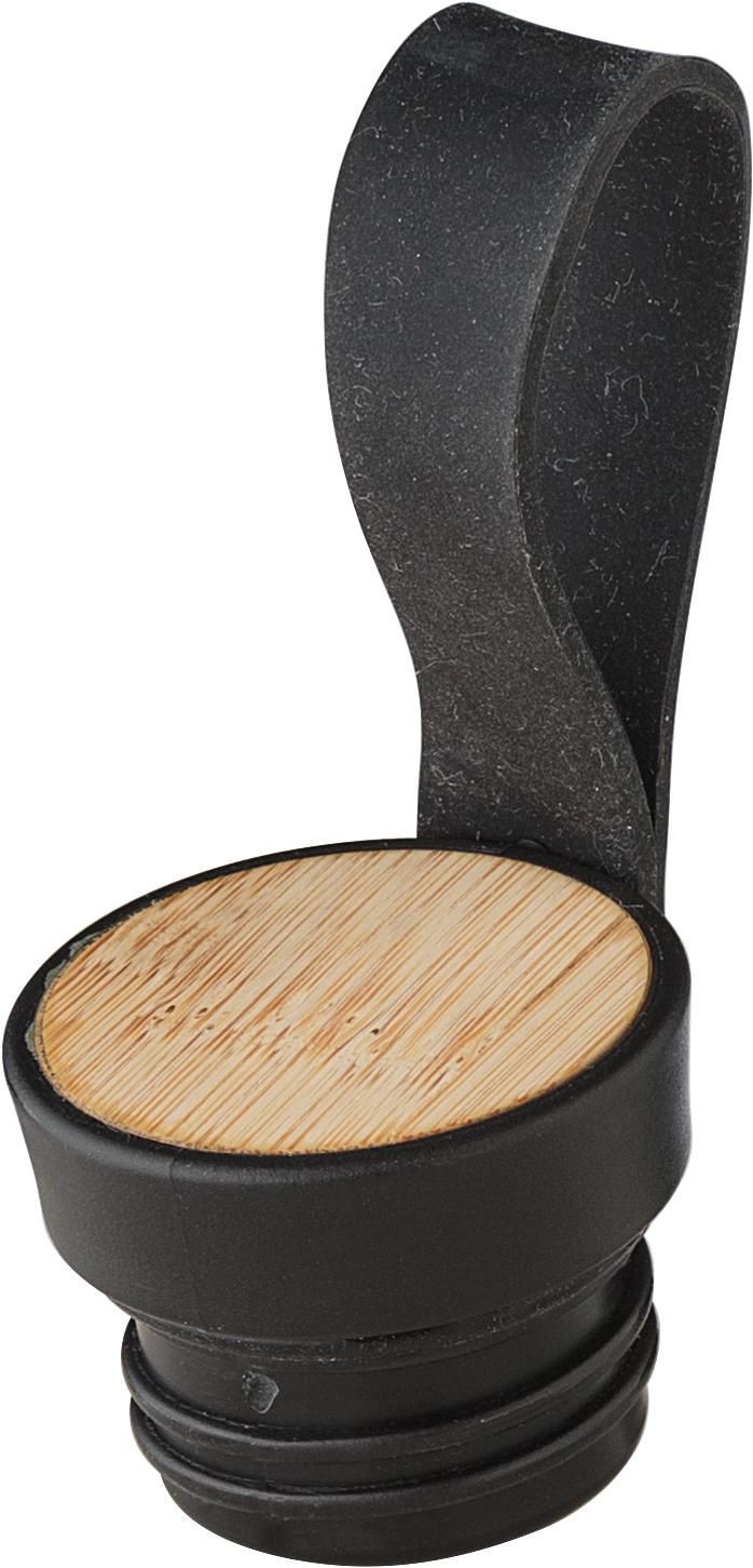Garrafa em rPET (500 ml) com tampa em PP e detalhes em bambu na parte superior. Inclui uma correia de silicone. Apresentado num saco de polietileno reciclado.