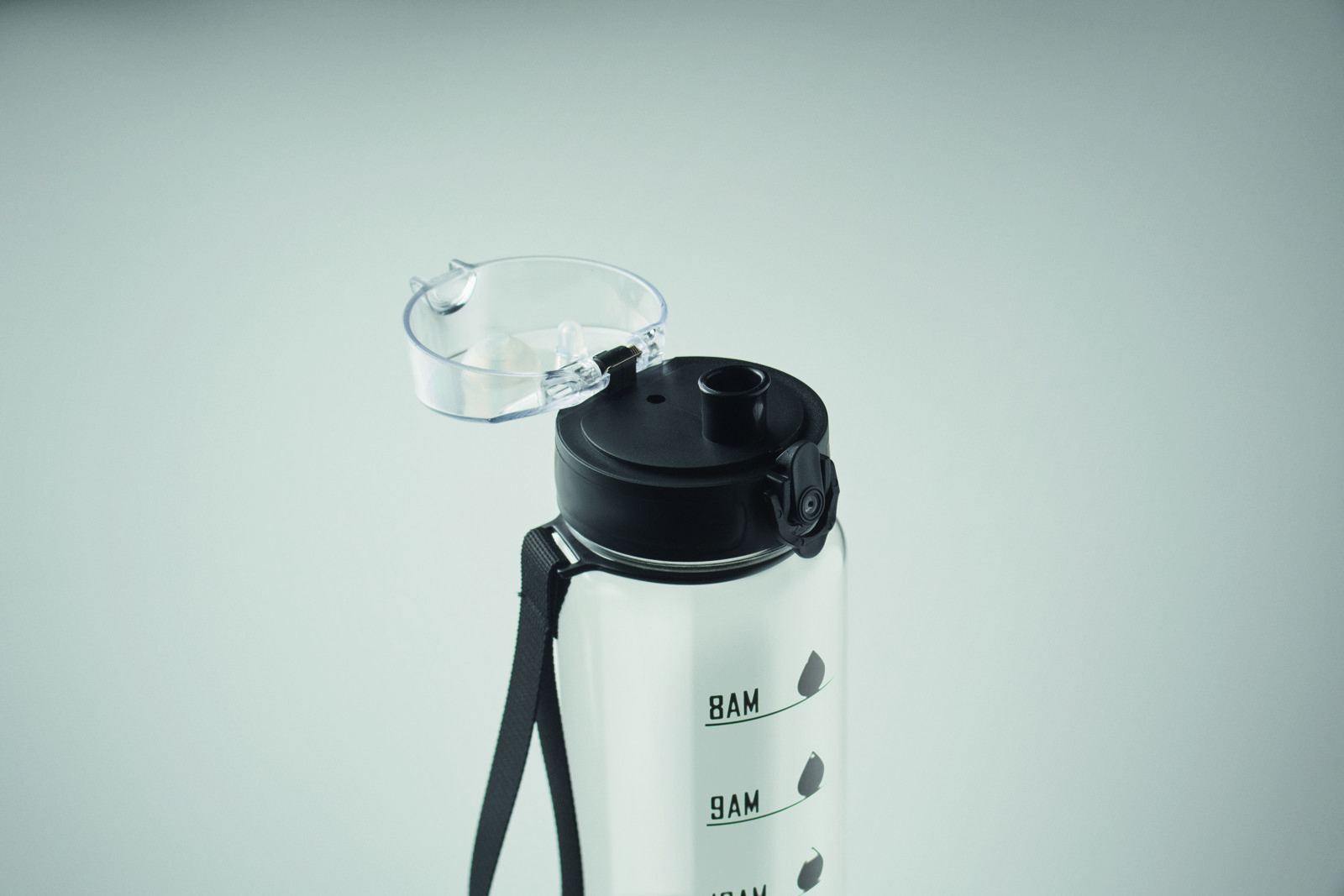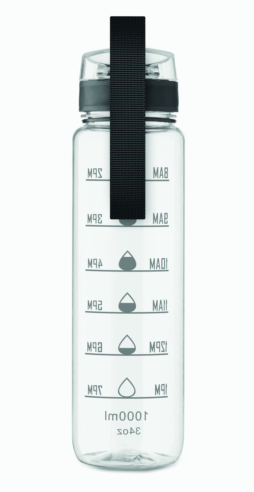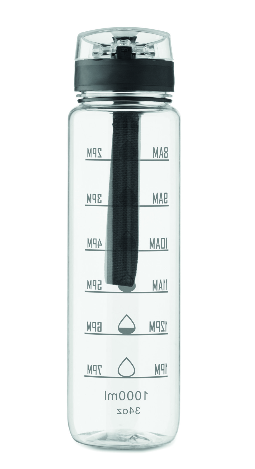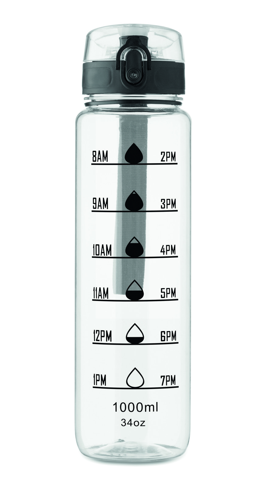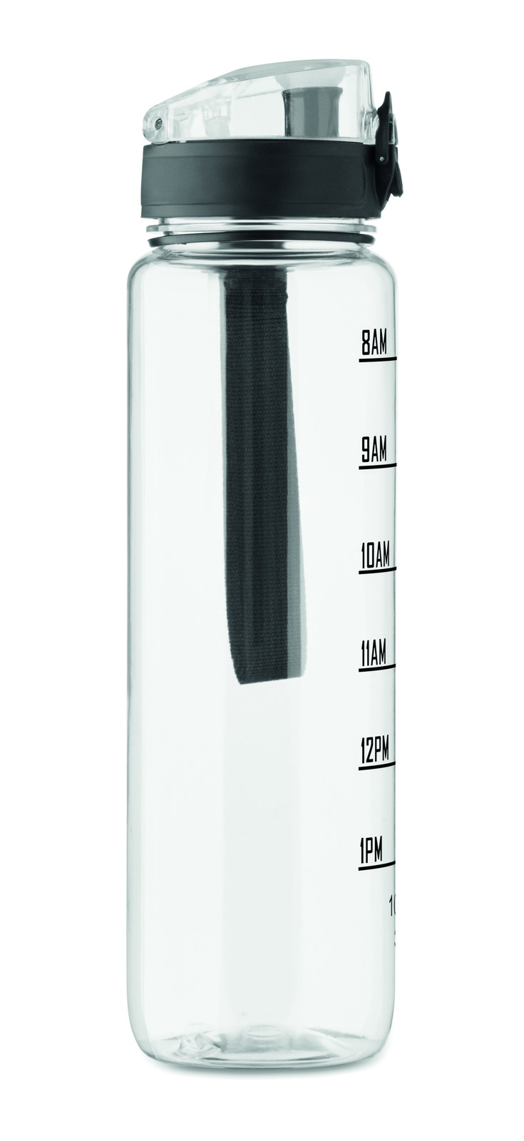 Garrafa de água desportiva em RPET, marcações de tempo motivadoras, tampa flip top com abertura com uma mão, fecho de segurança e alça de transporte. Sem fugas. Capacidade: 1L.