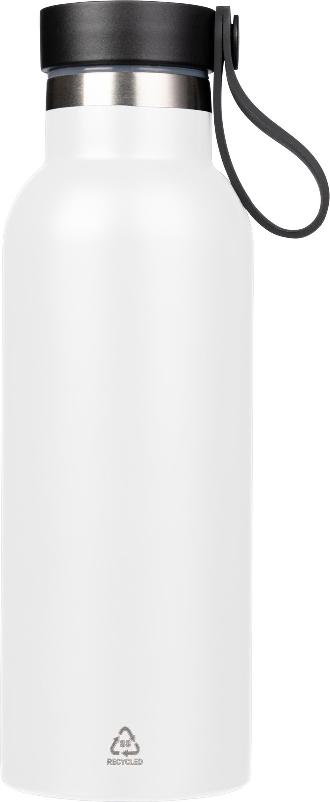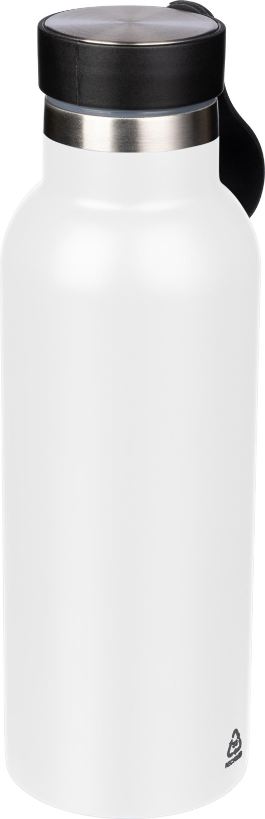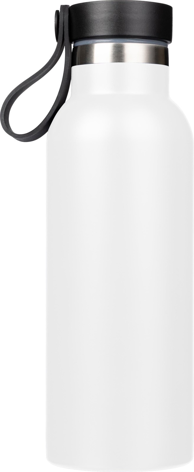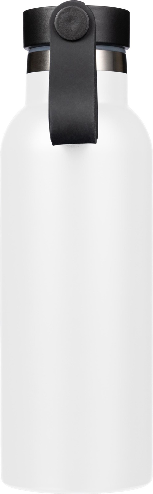 Garrafa em aço inoxidável de parede dupla (500 ml) com uma tampa de botão de pressão em PP e uma correia de silicone com detalhe metálico. Botão de pressão para abrir ou fechar o bico. O interior é feito de aço inoxidável 304 e o exterior é de aço inoxidável 201. Apresentado individualmente numa caixa de cartão castanha.