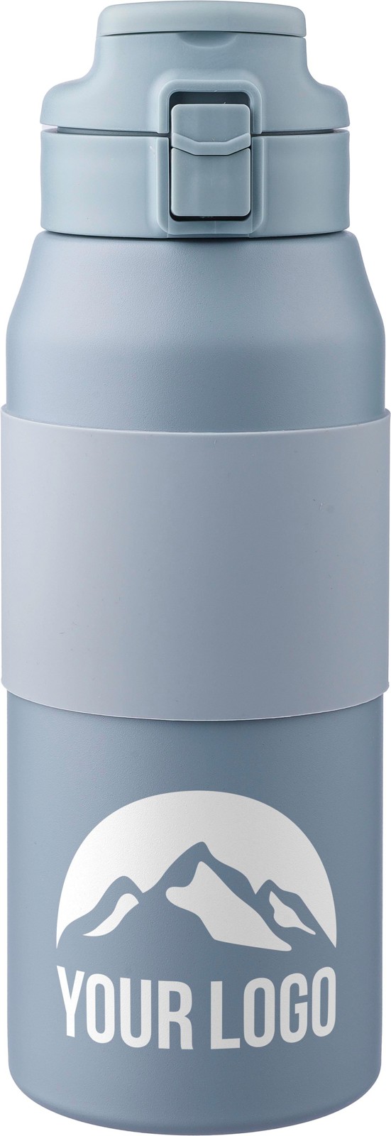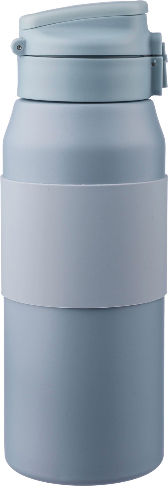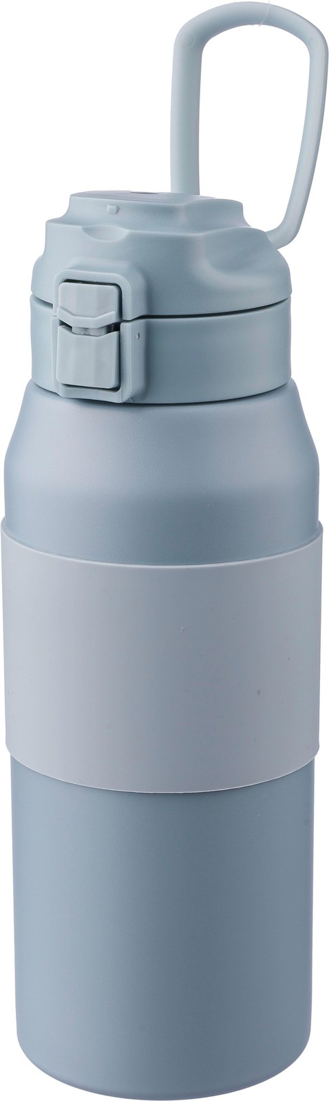 Garrafa em aço inoxidável de parede dupla (800 ml) com uma pega de silicone no corpo, palhinha, tampa PP e pega de transporte. Fabricada em aço inoxidável 304. Botão de pressão para abrir ou fechar o bico. Mantém o conteúdo quente durante 8 horas e frio durante 12 horas. Apresentada individualmente numa caixa de cartão castanha.